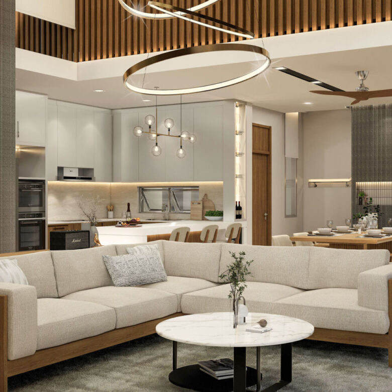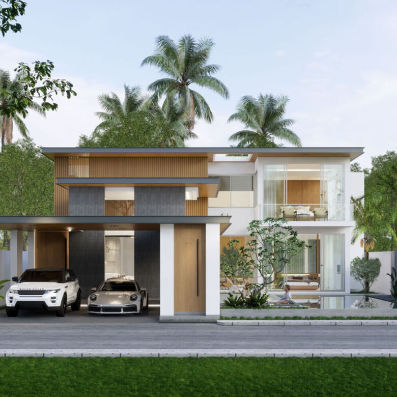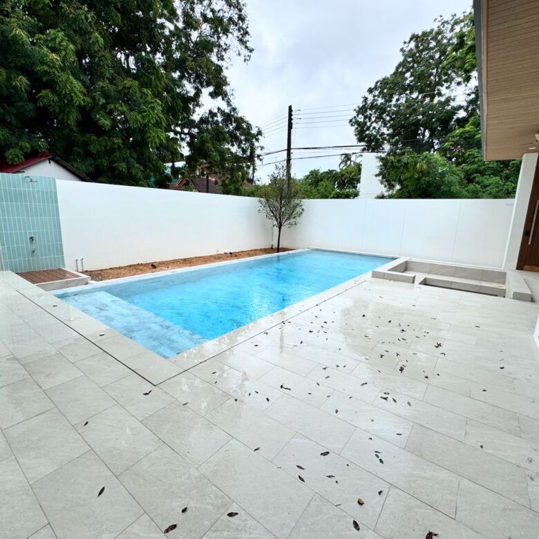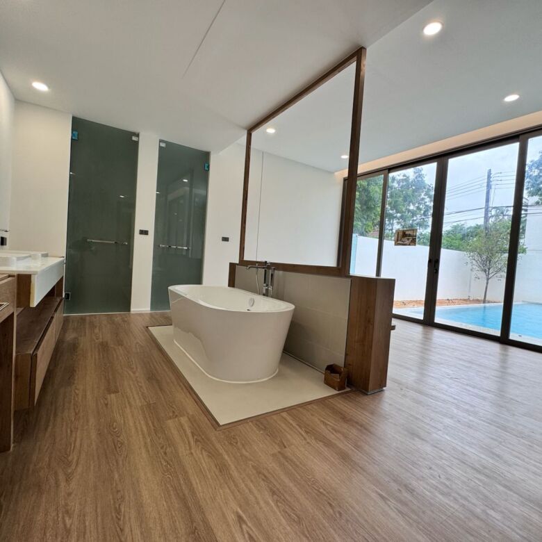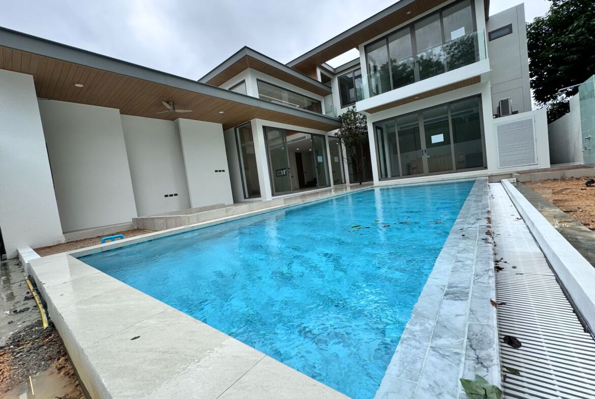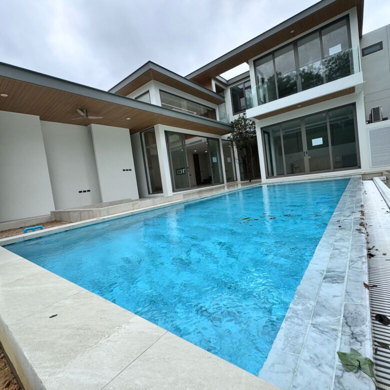 Sitting on a 320 sqm land plot with a total usable area of 315 sqm, the villa is laid out over two floors and includes a large 4×10 meter private swimming pool, a spacious sunken lounge area with LCD TV, and beautifully landscaped outdoor living zones. The villa’s open-plan layout highlights 4.6-meter-high ceilings and large windows that draw in natural light and garden views. Every detail is designed to elevate your lifestyle, from premium finishes and teak wood elements to seamless indoor-outdoor flow.