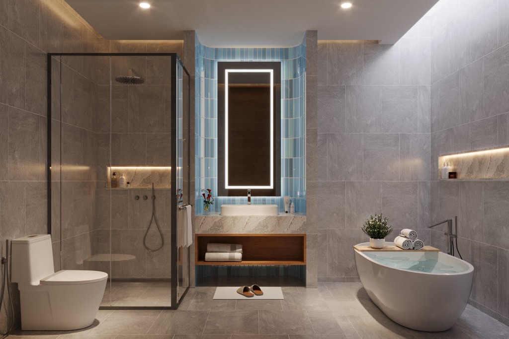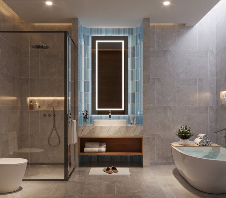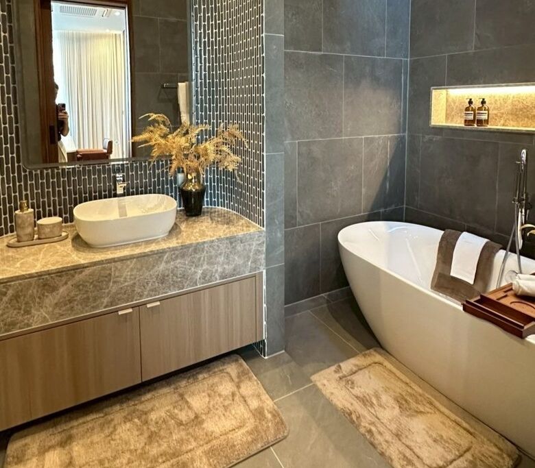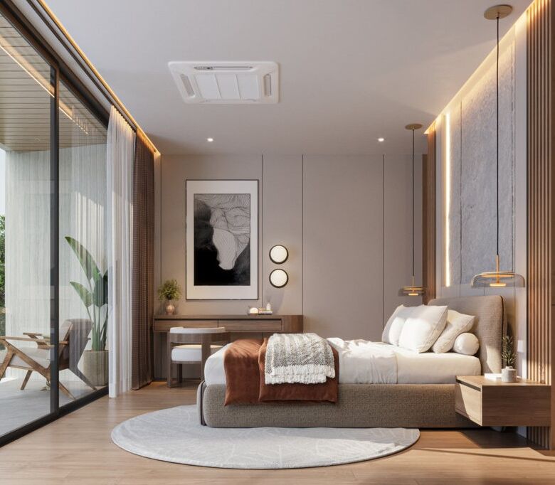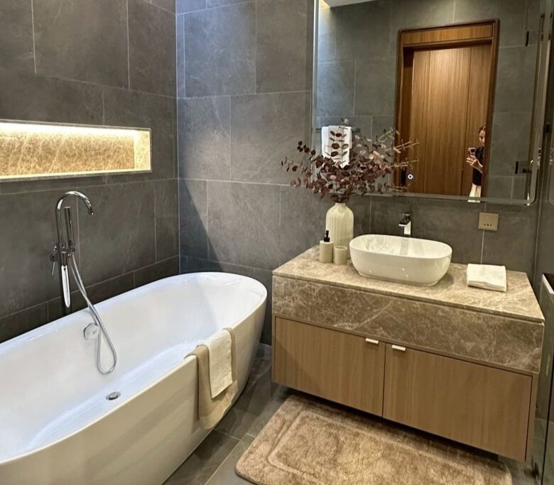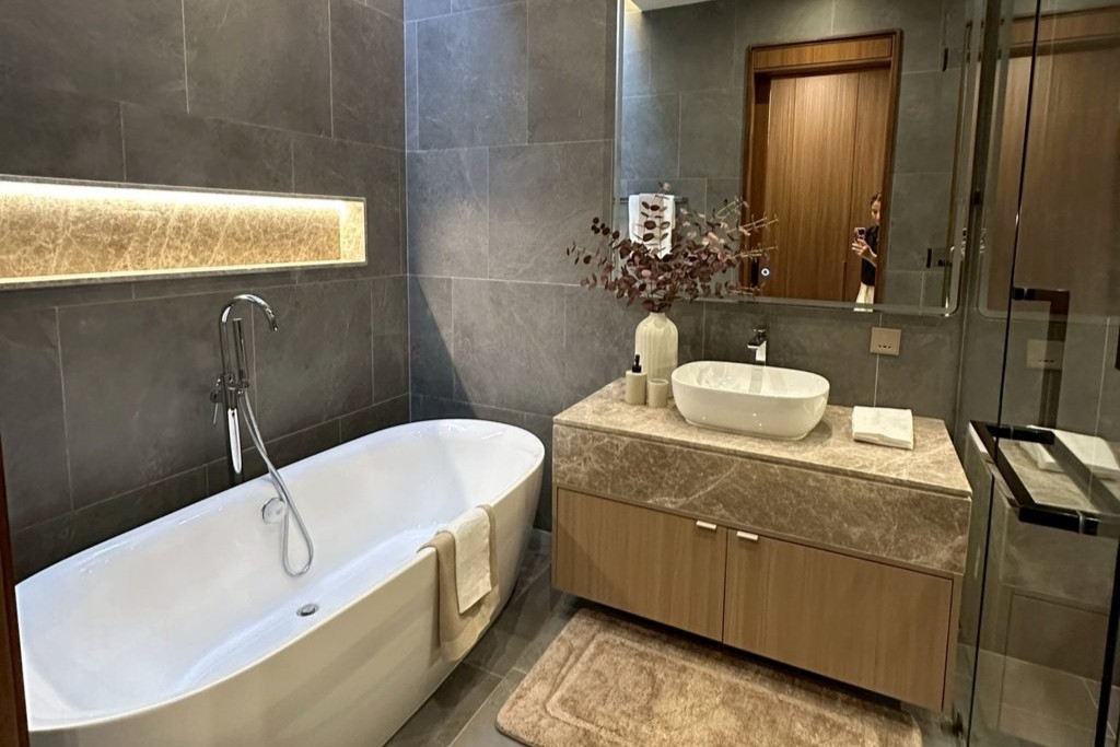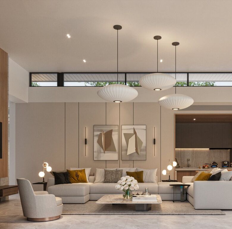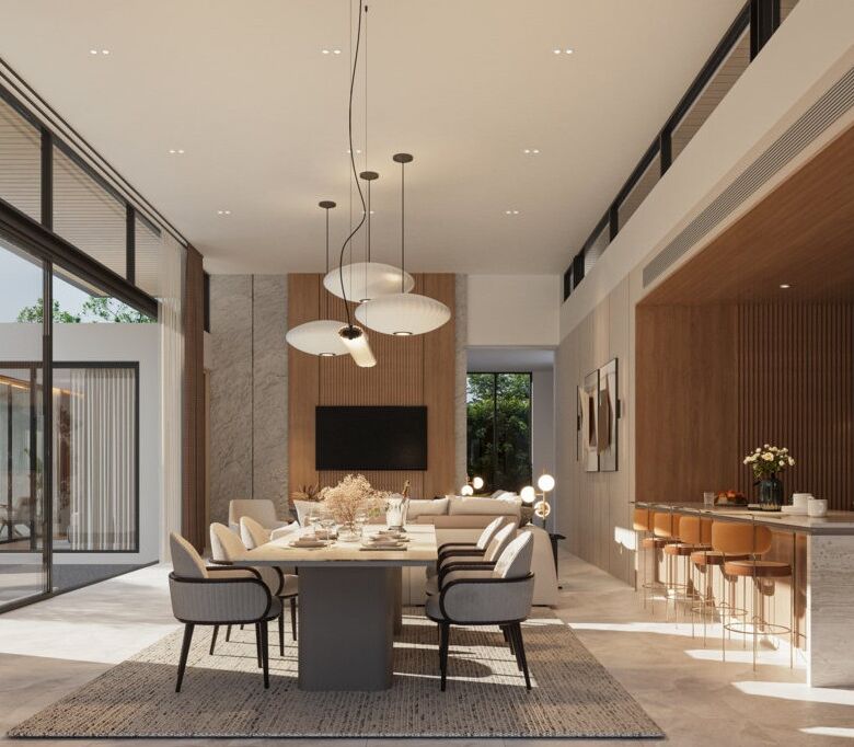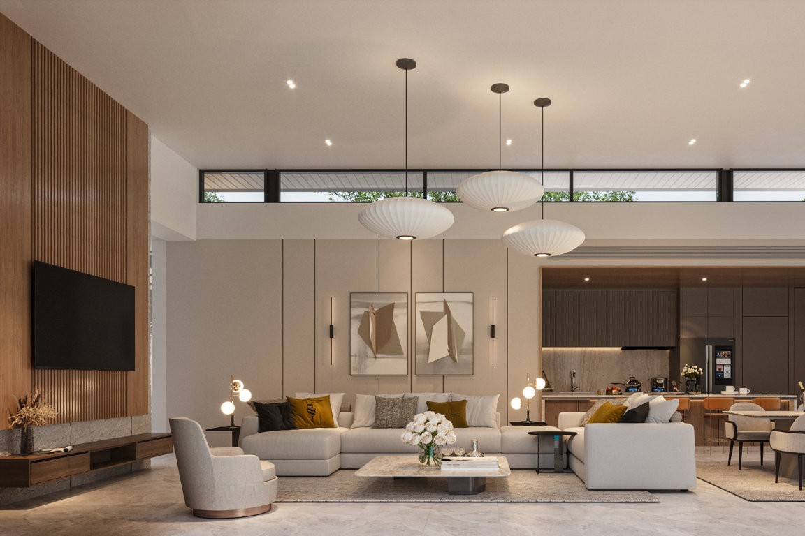 Inspired by amber’s timeless beauty, the villas feature sleek modern lines, premium materials like marble flooring and wood accents, and open-plan layouts that blur indoor-outdoor boundaries. Interiors showcase elegant living rooms with high ceilings and pendant lighting, gourmet kitchens with islands, spa-like bathrooms with freestanding tubs and rain showers, and bedrooms with panoramic views. Renders depict sophisticated spaces filled with natural light, neutral palettes, and touches of luxury – from infinity pools cascading into greenery to private terraces for al fresco dining.