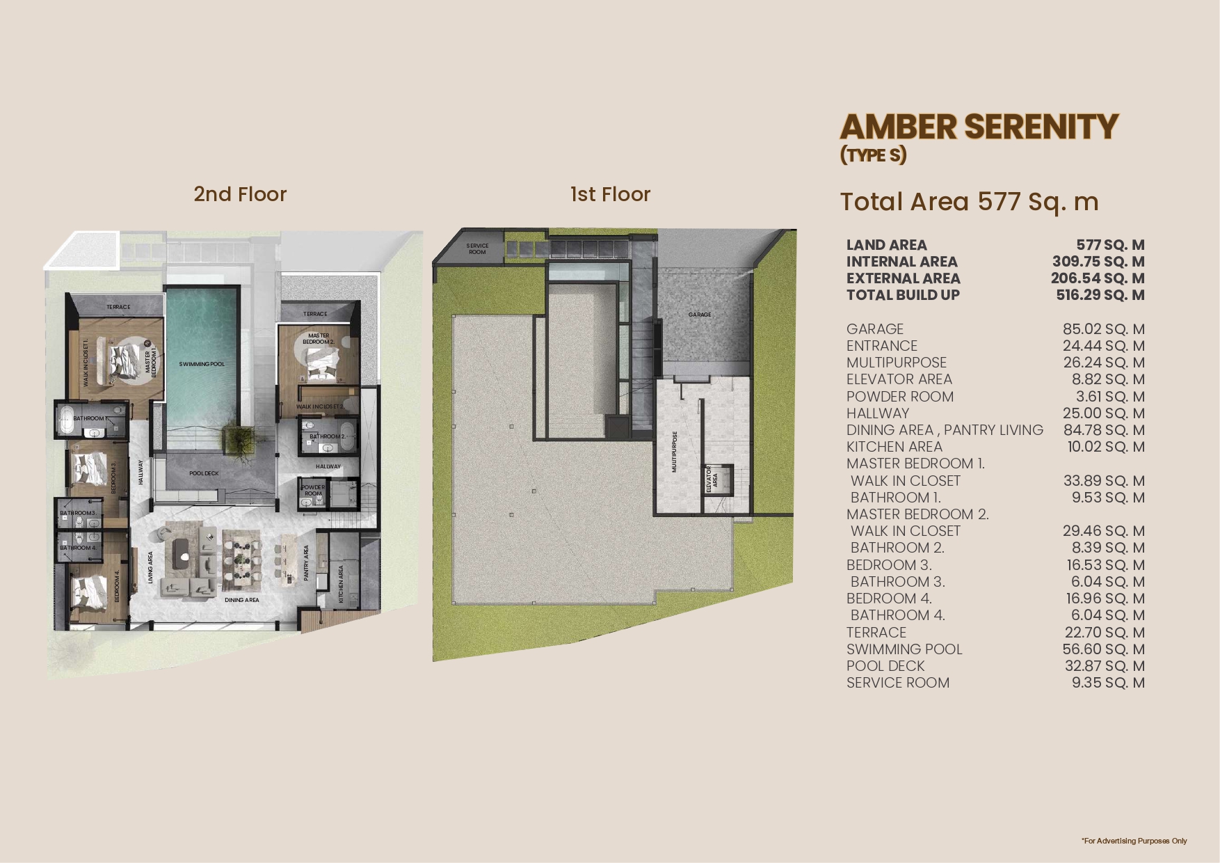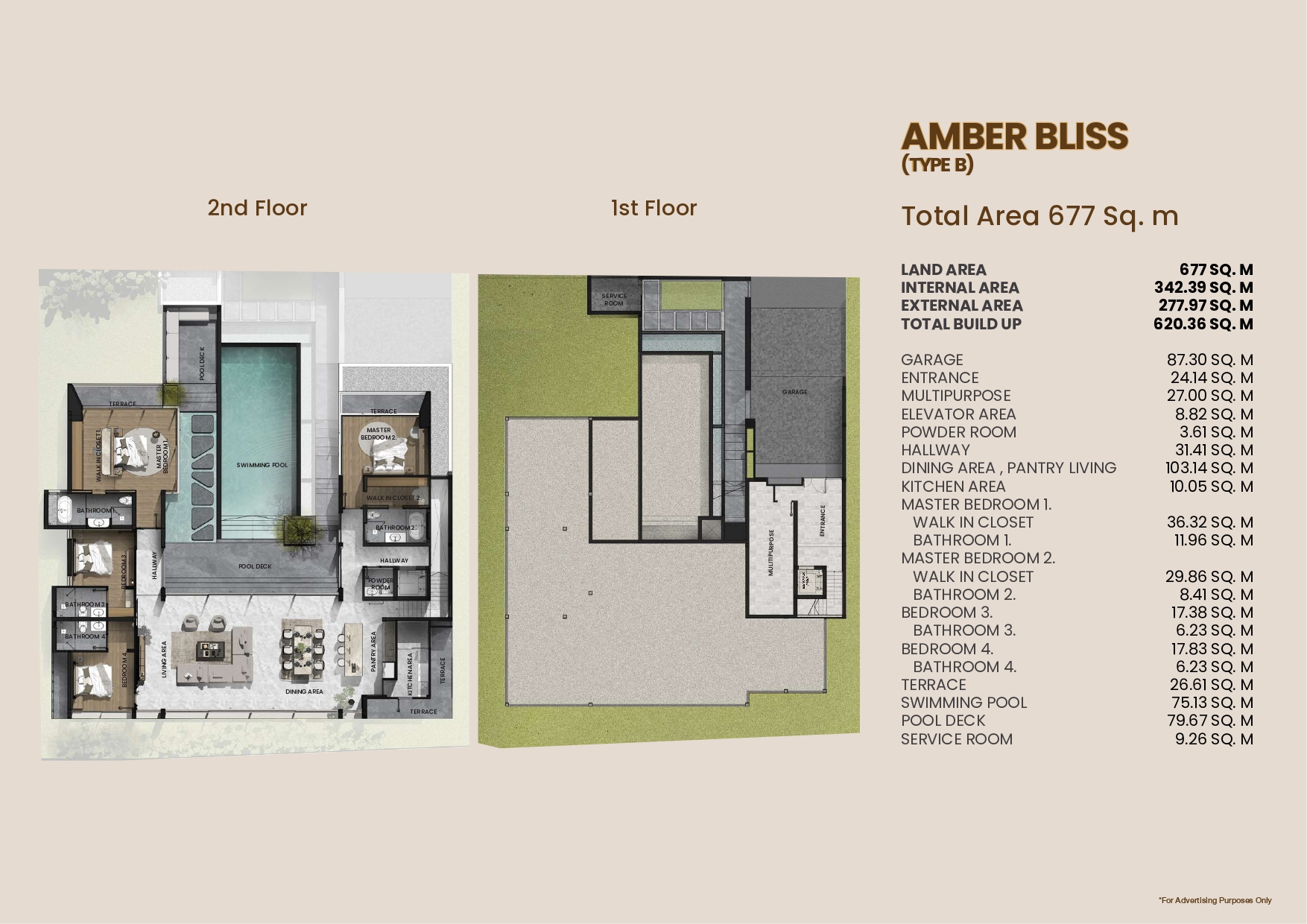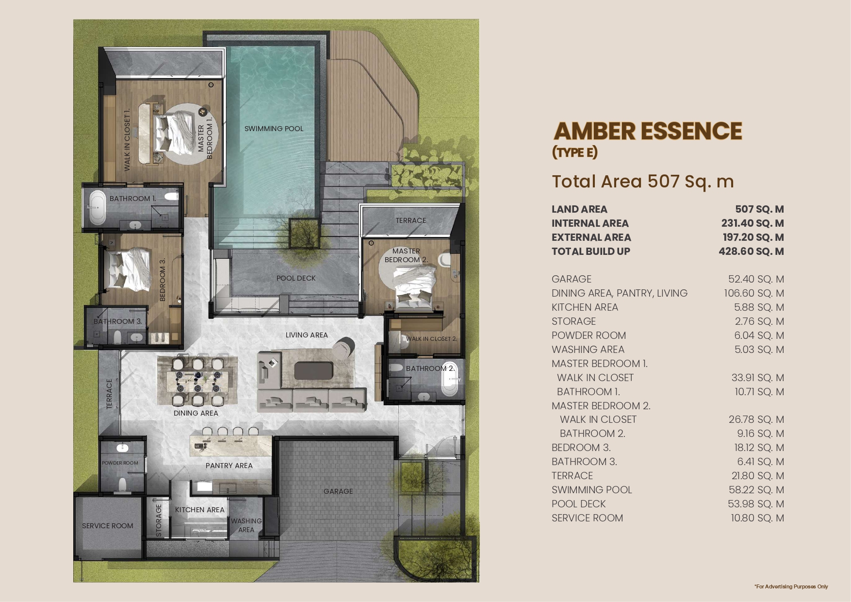 Amber Chamber offers three distinct villa types, each tailored to different lifestyles while sharing premium features like private swimming pools, spacious garages, fully equipped kitchens, and high-end finishes. All units boast living areas ranging from approximately 428.60 to 620.36 square meters, with thoughtful layouts that maximize space and flow.