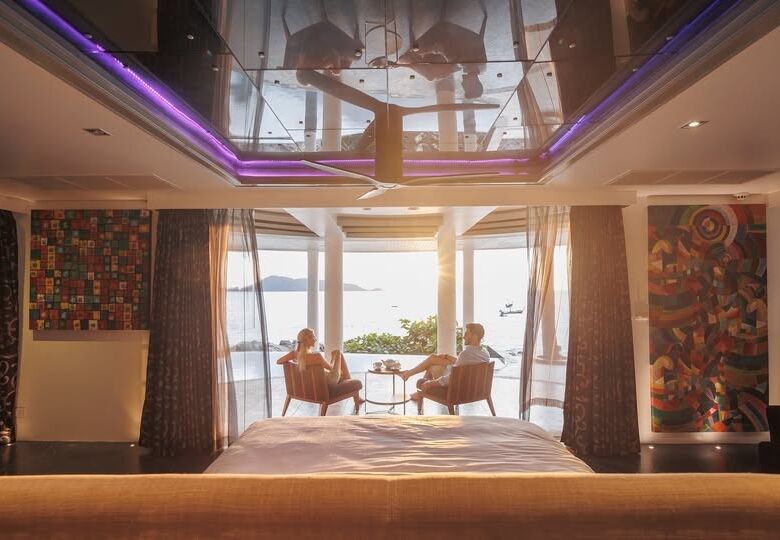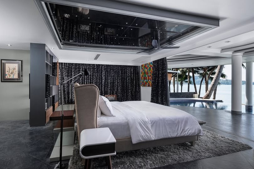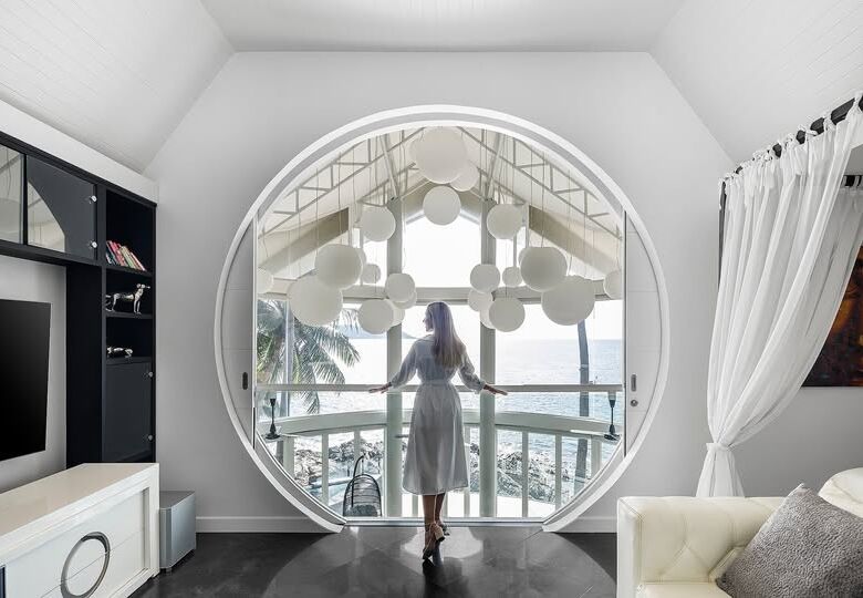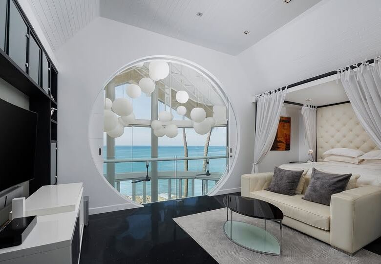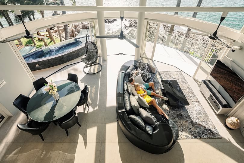 - Full-height glass walls capturing 180-degree sea views