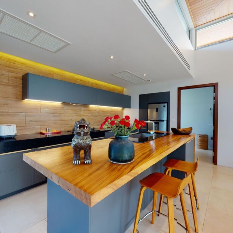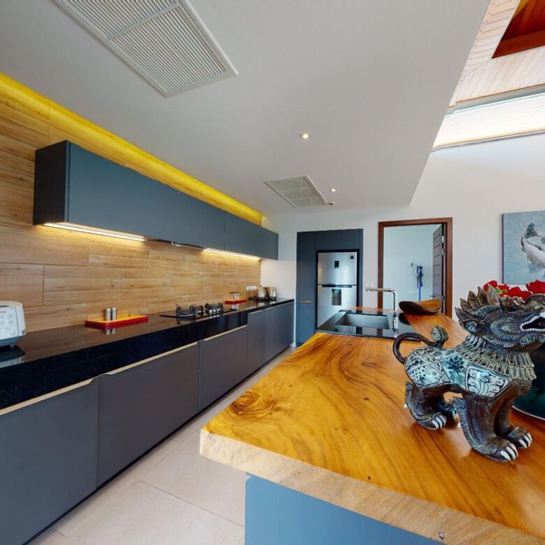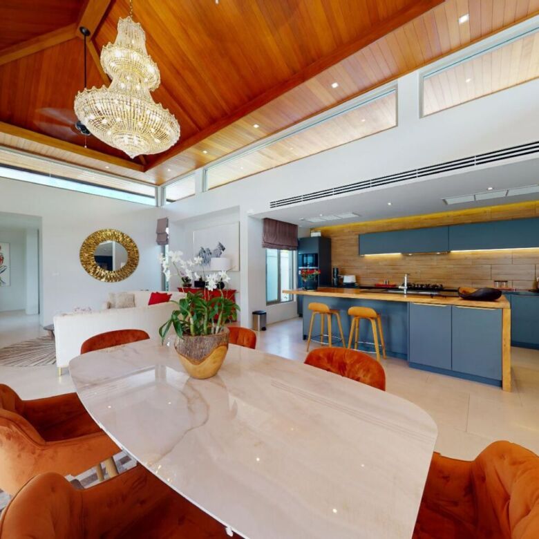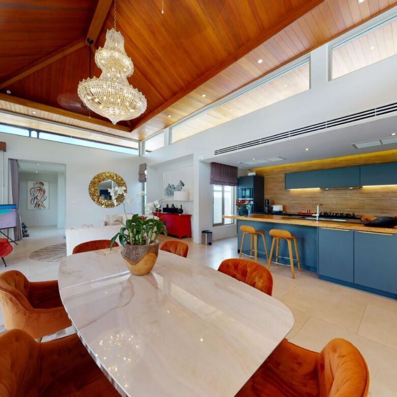 Designed with sophistication and comfort in mind, the villa features a Snaidero Italian kitchen, high-end European appliances, designer furnishings, and a saltwater pool. The interior space spans approximately 180 sqm, with an open-plan layout including a living room, dining area, and three well-appointed bedrooms.