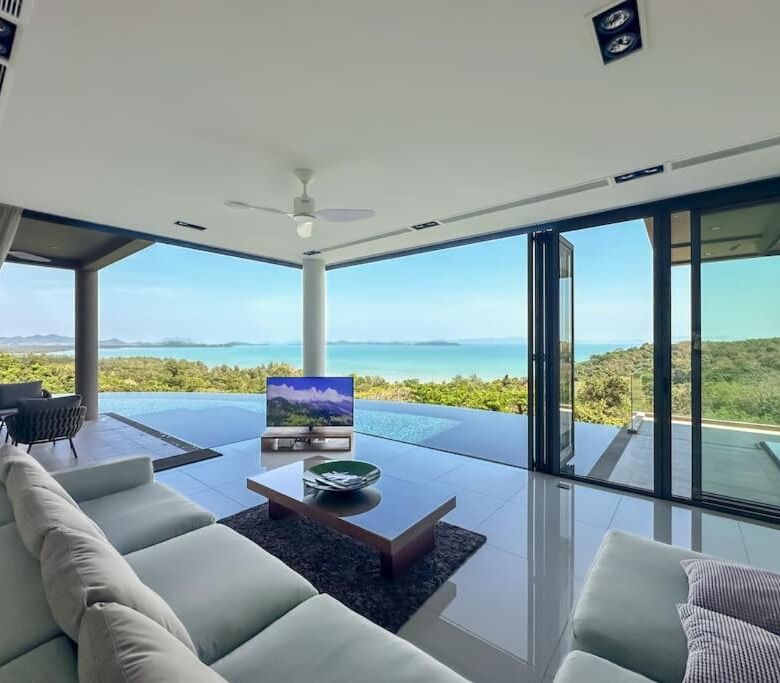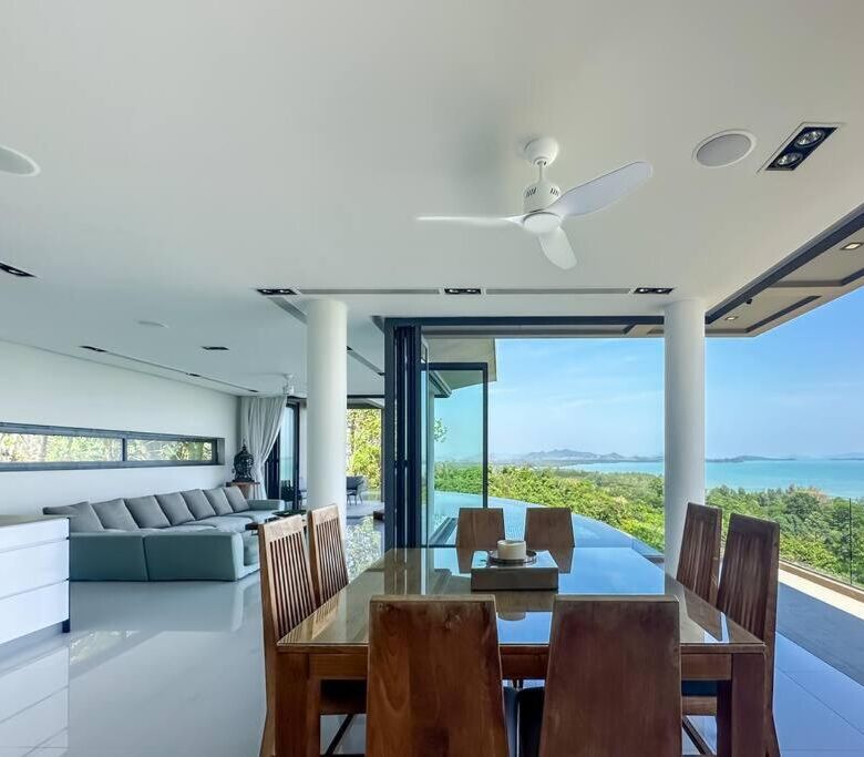 The villa’s contemporary architecture blends clean lines with tropical design elements, creating spacious interiors that flow seamlessly onto expansive terraces. The open-plan living and dining area is designed to maximize natural light and the extraordinary sea views, while the fully equipped modern kitchen makes entertaining effortless.