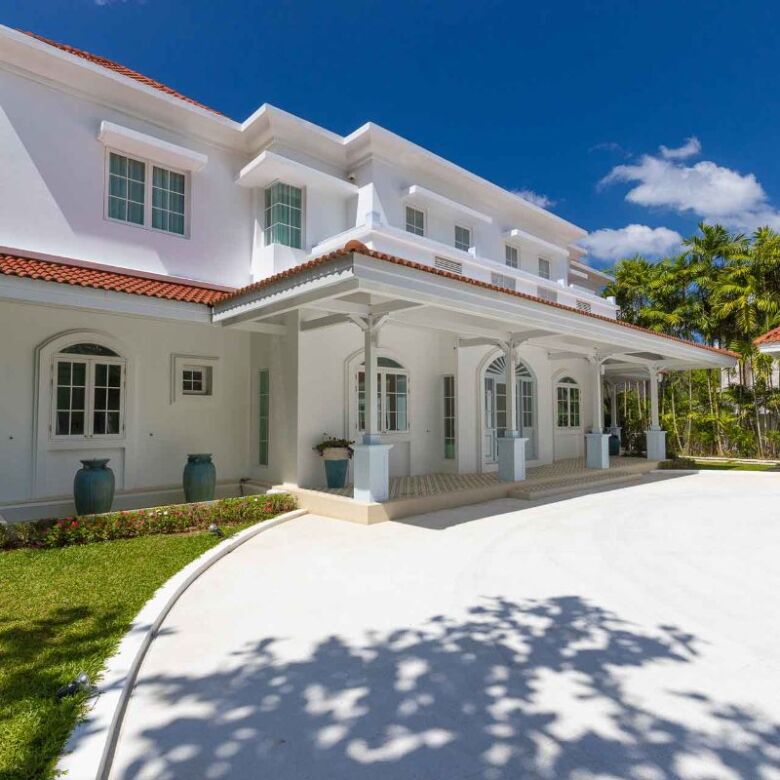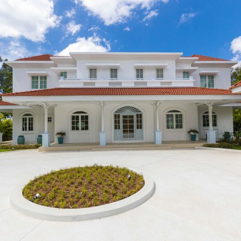 Upon arrival, a set of automated gates welcomes you, leading to an expansive circular driveway capable of accommodating up to 12 vehicles. The driveway is enveloped by lush, meticulously landscaped tropical gardens.