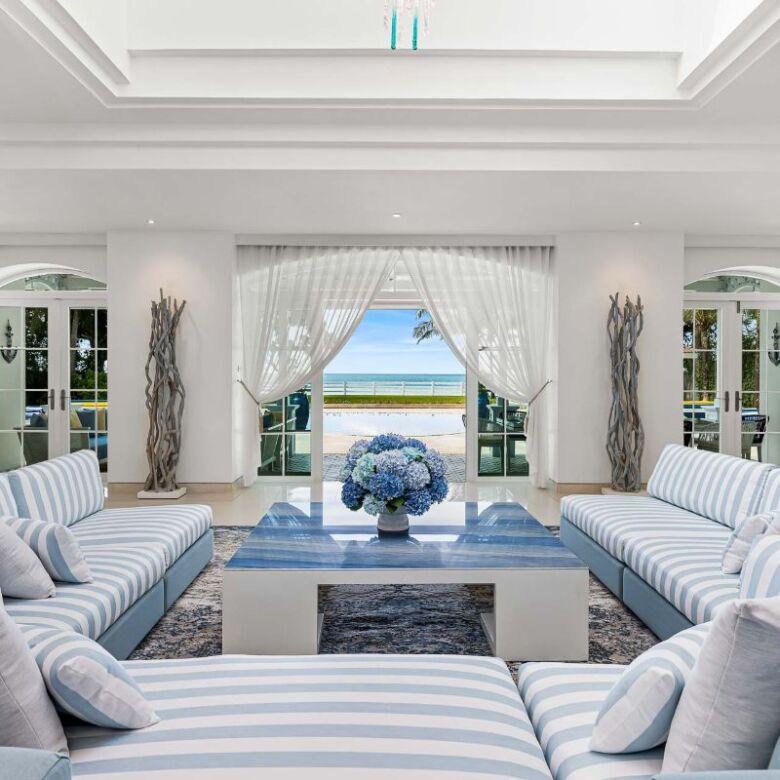 Ascend the stairs to find a spacious landing that overlooks the lounge and dining area below, leading to four opulent suites. Among them, two master bedrooms are virtually identical, each with walk-in robes and sumptuously appointed ensuite bathrooms featuring showers, baths, and double vanities. These master suites open onto large private balconies, offering commanding views of the pool, beach, and the vast expanse of the sea.