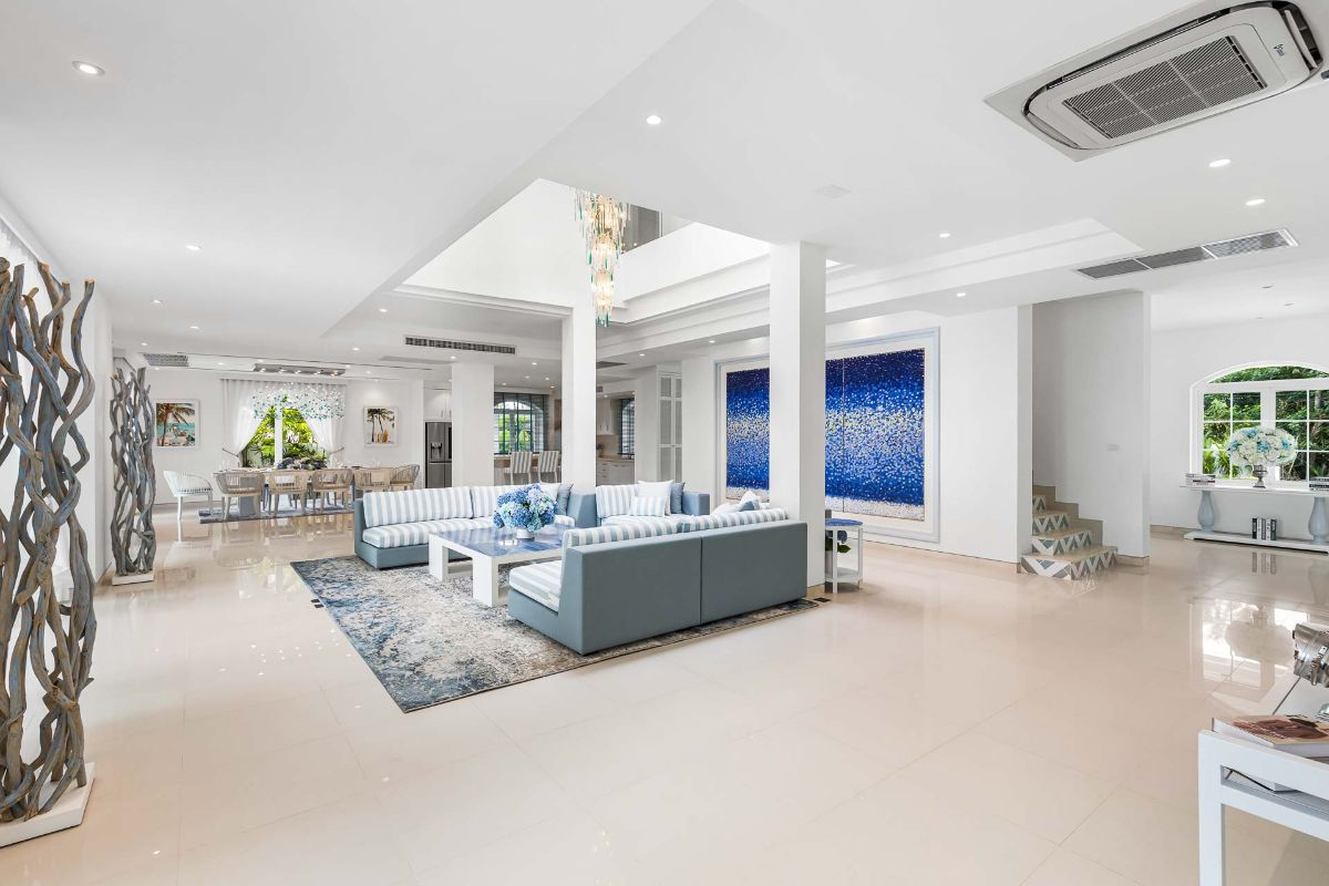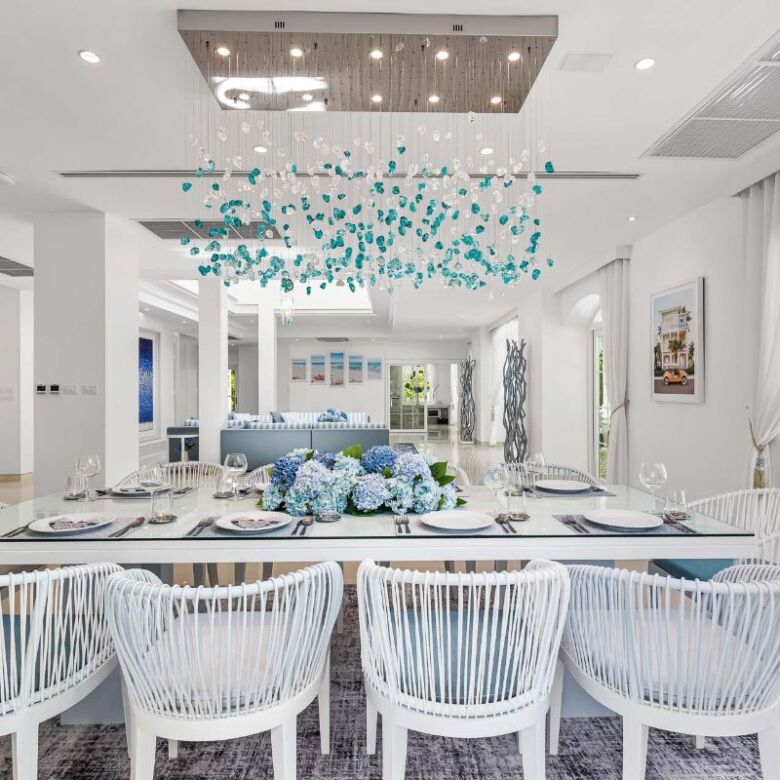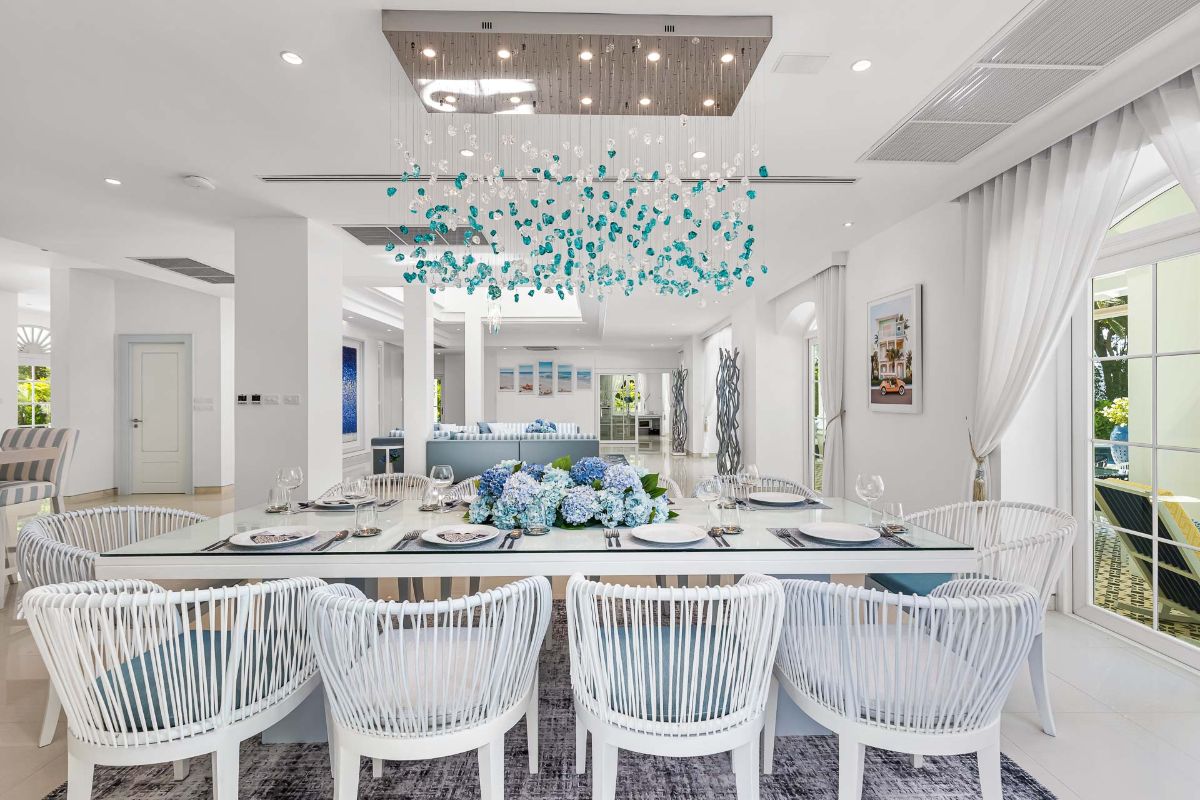 The grand entrance unfolds to the spacious open-plan ground floor of the main residence. With soaring ceilings and expansive windows offering breath-taking sea and garden vistas, the area comprises a well-appointed kitchen, an indoor dining space, and a generous lounge area crowned by a double-height skylight adorned with a magnificent chandelier, bathing the space in abundant natural light. All of this opens up to the glistening swimming pool and panoramic views of the beach and the Andaman Sea.