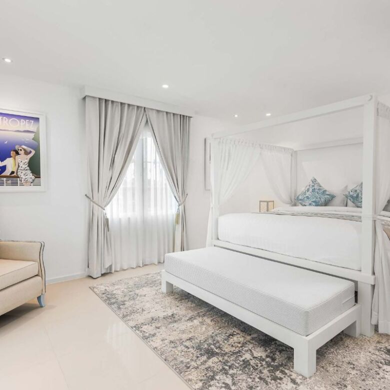 At the rear of the property, set upon the lush, grassy lawns, a newly constructed, annexed bedroom suite has been constructed. Consisting of two further sumptuous bedroom suites, both with opulent ensuite bathrooms, and a private living room. Currently configured as one double bed, and two singles + roll out beds – All allowing guests privacy amid this outstanding, beach front estate.