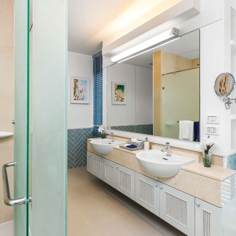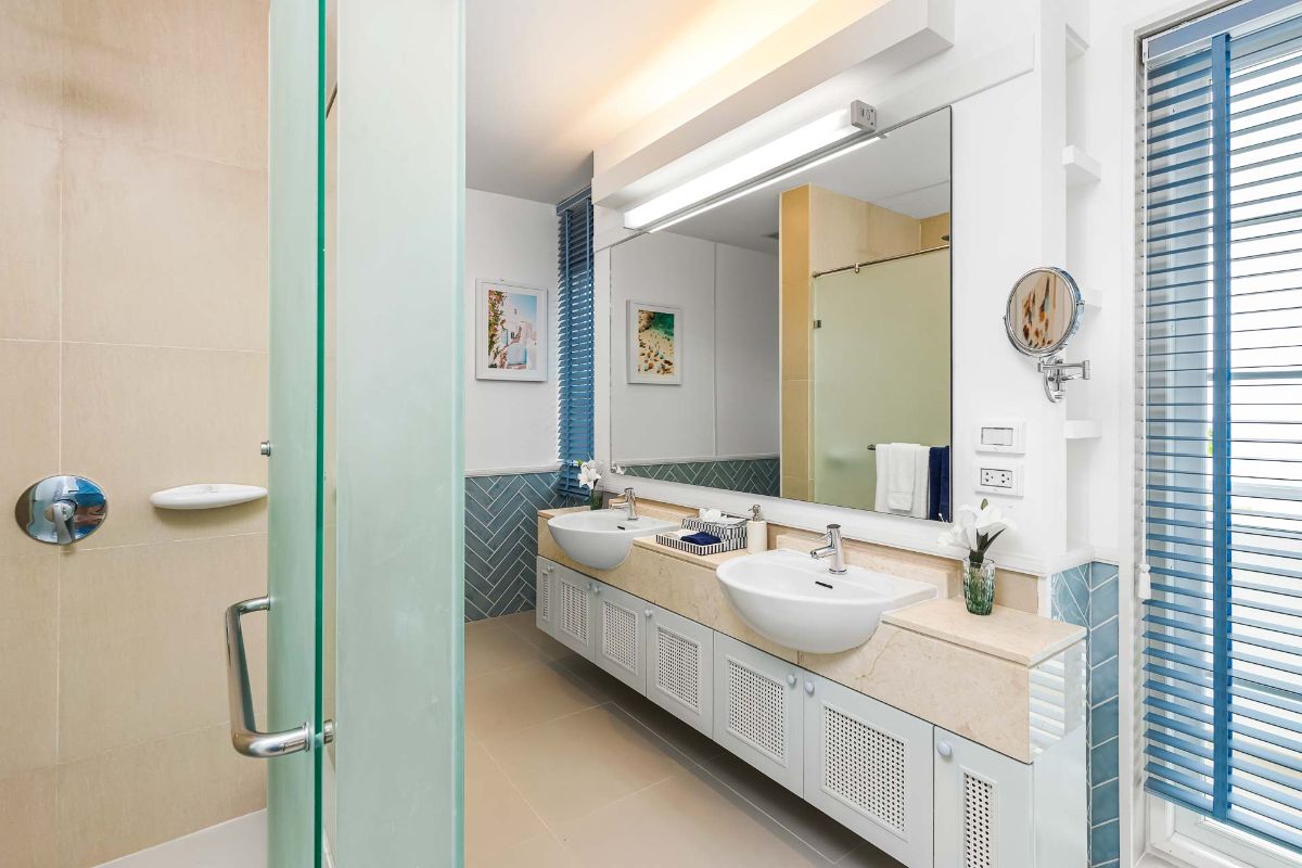 The other two bedrooms, also graced with sea views from their balconies, boast walk-in robes and ensuite bathrooms with baths and double vanities. Currently, these rooms are configured as 1 double and 2 singles + roll out beds