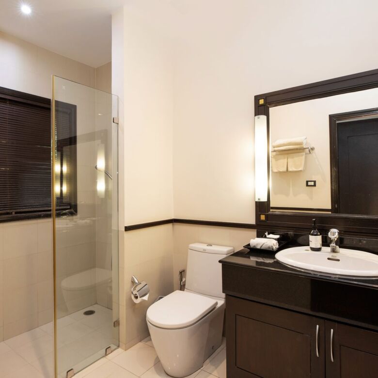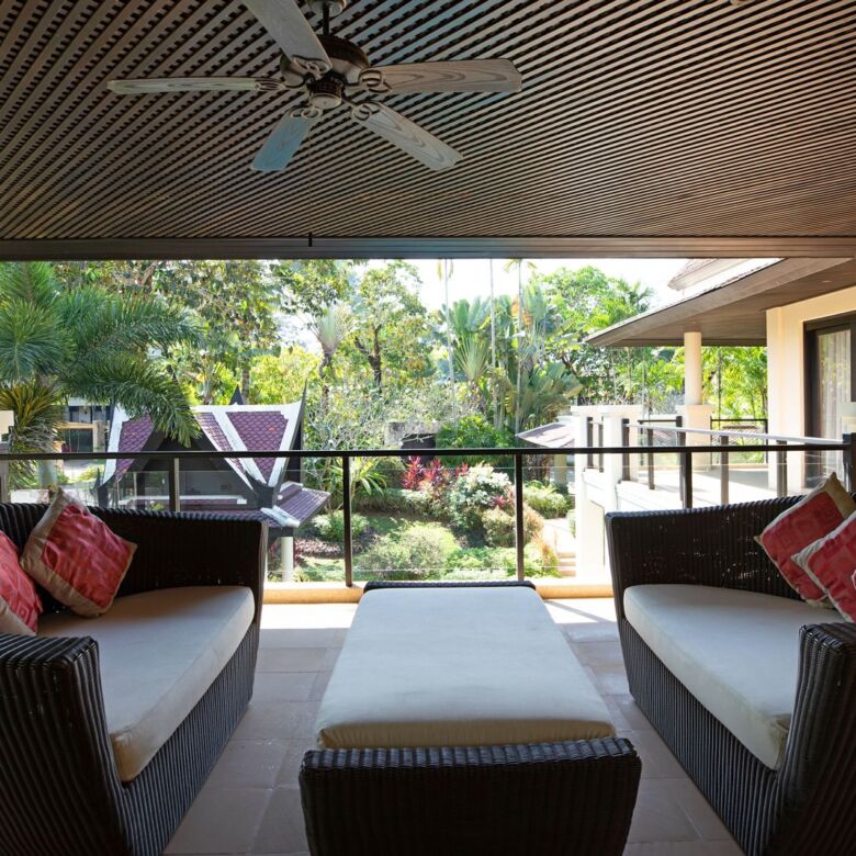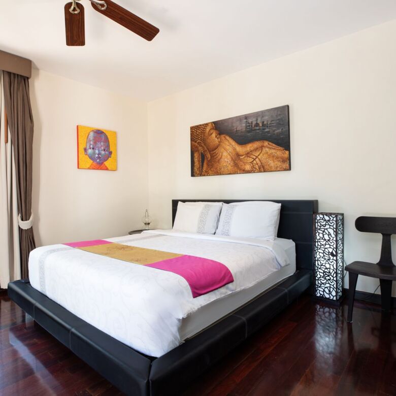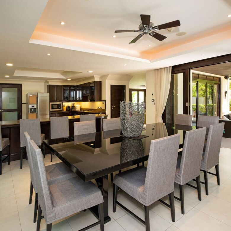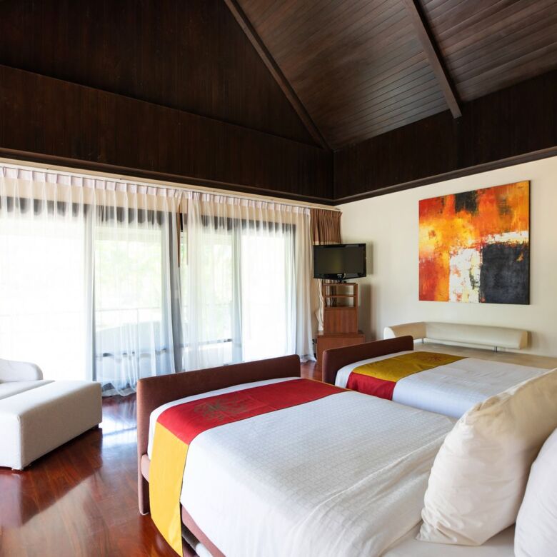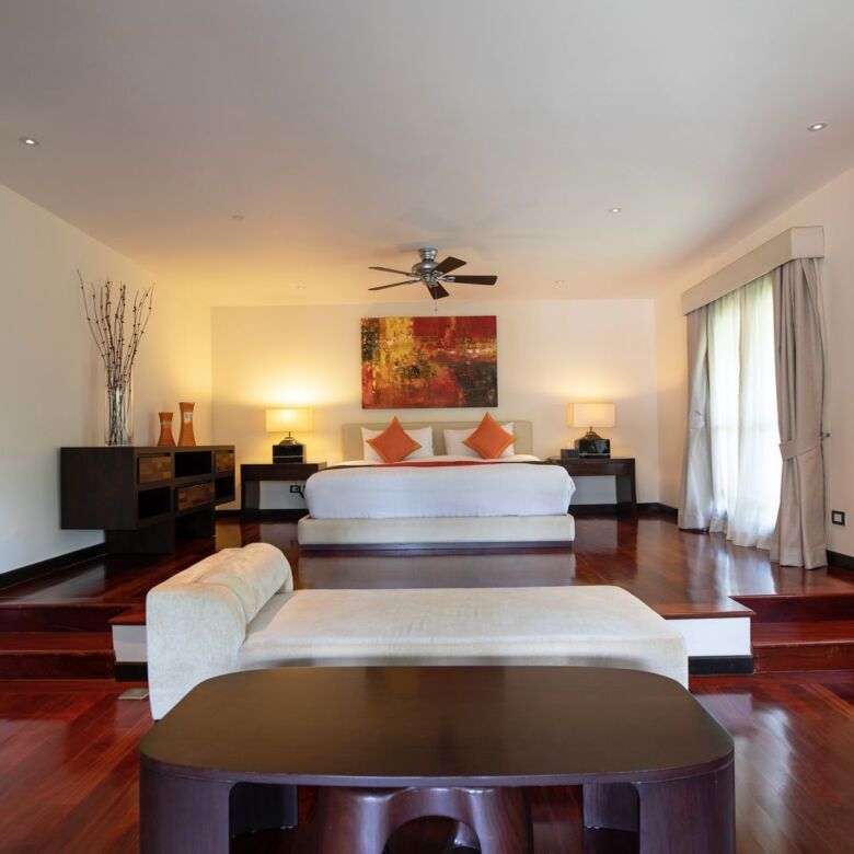 The villa features 4 spacious double bedrooms, all with ensuite bathrooms, including a versatile twin room perfect for guests or children. The thoughtfully designed layout blends indoor and outdoor living, with a private swimming pool, tropical landscaped gardens, and a traditional Thai sala for shaded relaxation and entertaining.