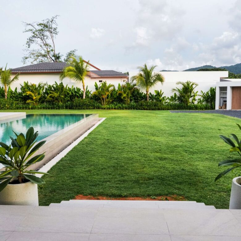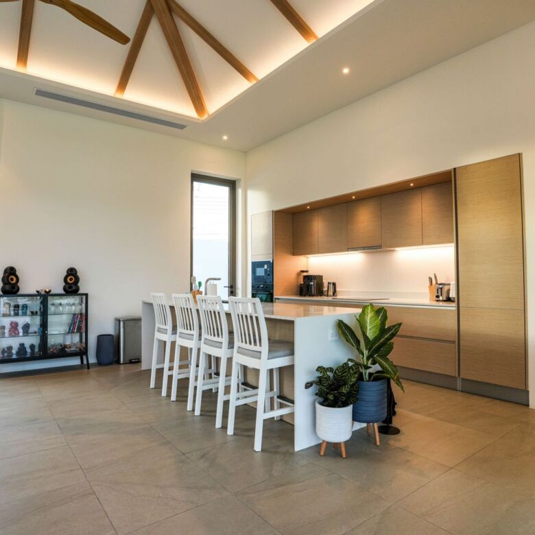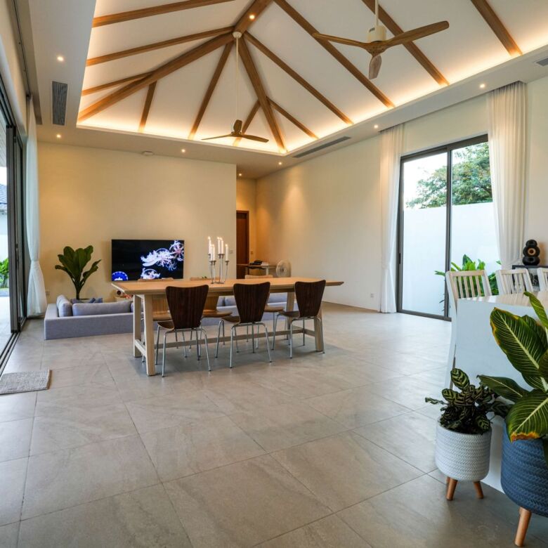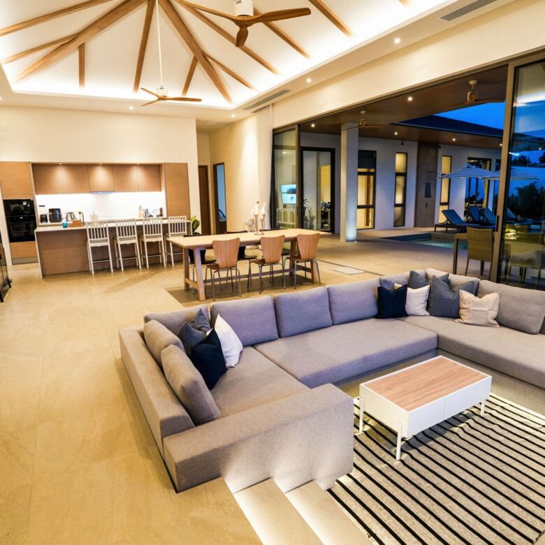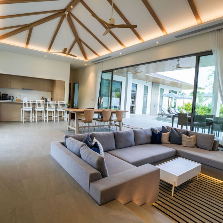 This architectural gem harmoniously blends contemporary design with tropical elements to create an atmosphere of refined elegance. Floor-to-ceiling windows throughout the villa flood the interior with natural light while showcasing the meticulously landscaped gardens beyond.