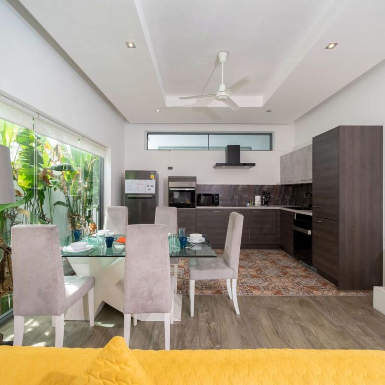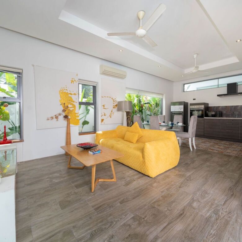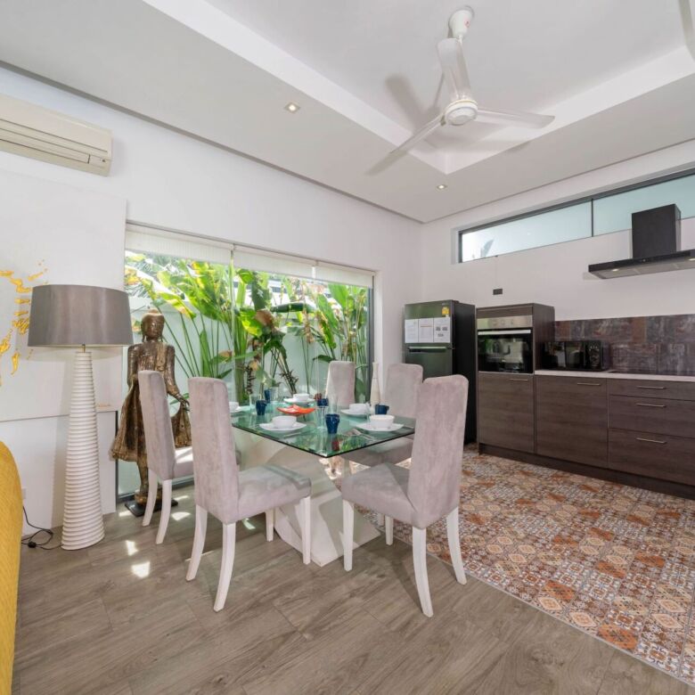 Built on a 300 sqm freehold land plot, the villa offers 120 sqm of interior living space wrapped around a serene saltwater swimming pool (8m x 4m). Inside, you’ll find a warm, art-filled atmosphere with thoughtful details and high-quality finishes throughout. The open-plan living and dining area flows effortlessly to the sun deck, creating an inviting indoor-outdoor living experience.