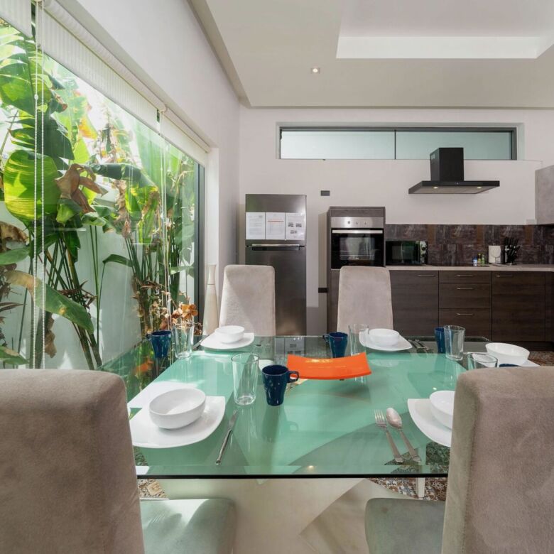 Each of the two ensuite bedrooms is uniquely designed with its own colour theme and direct access to the pool, offering privacy and a tranquil ambiance.