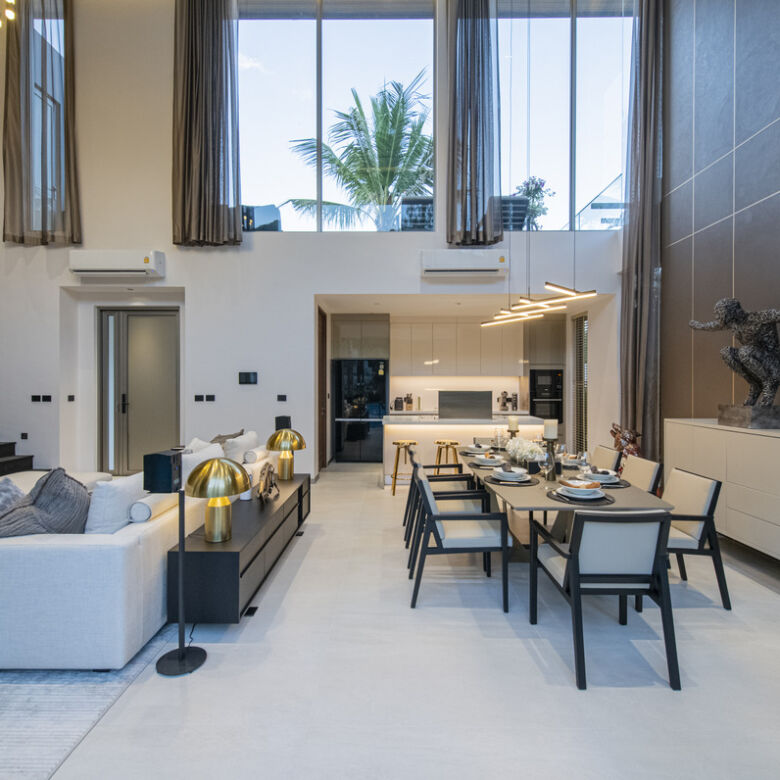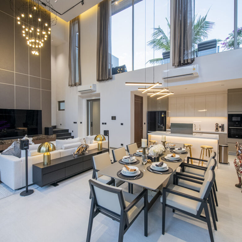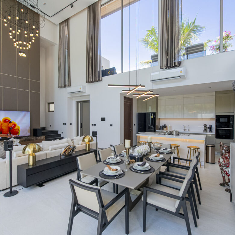 This stylish off-plan villa is thoughtfully designed over two floors, ideal for families or investors seeking a spacious residence. The master suite features direct access to the pool, a walk-in closet, and a luxurious ensuite with a separate bathtub and shower. The open-plan living and dining area with double-height ceilings brings in natural light and a feeling of openness. The Western kitchen comes with a cooking island and breakfast bar—perfect for everyday living and entertaining.