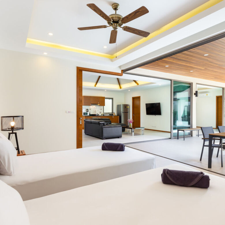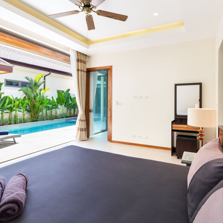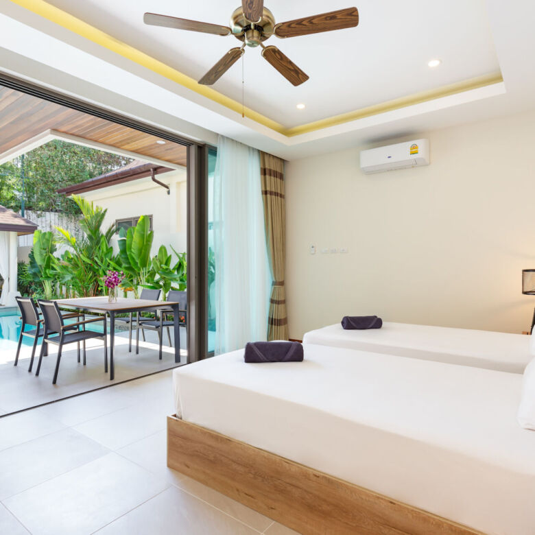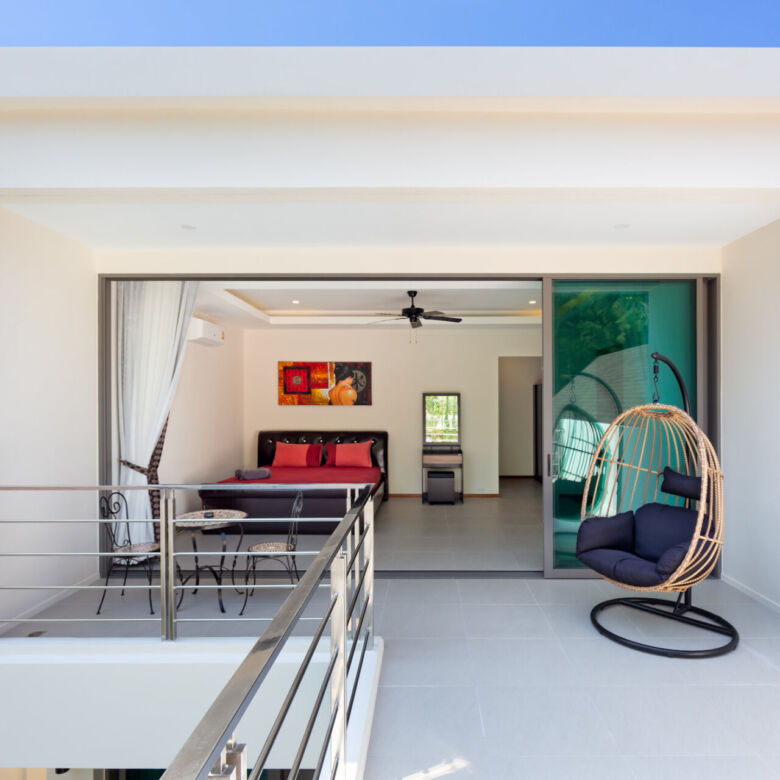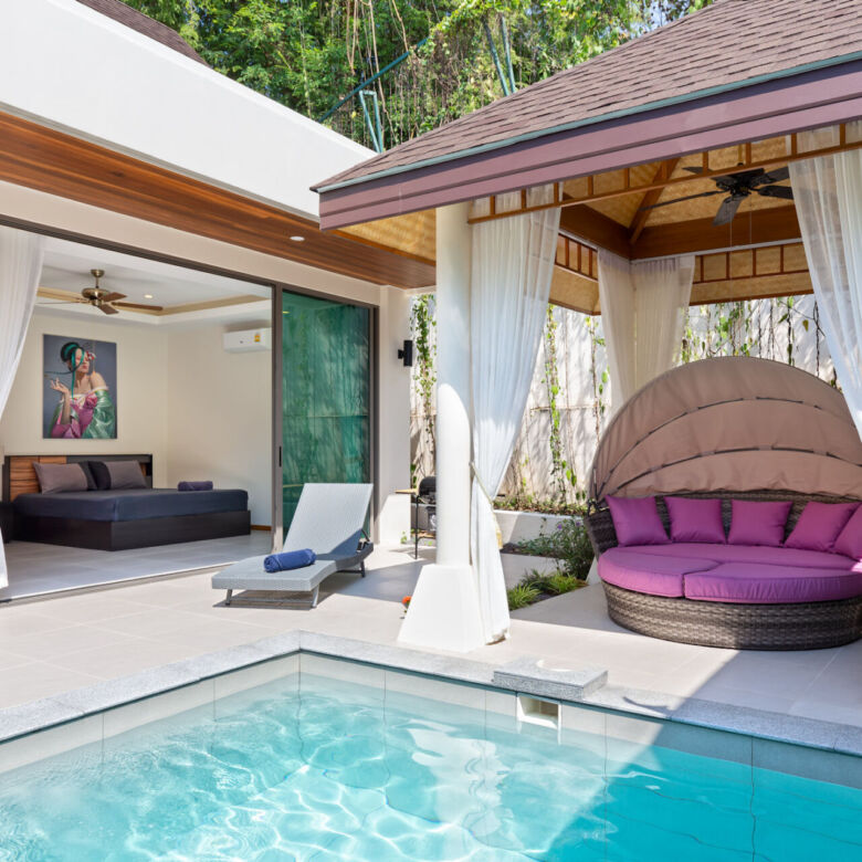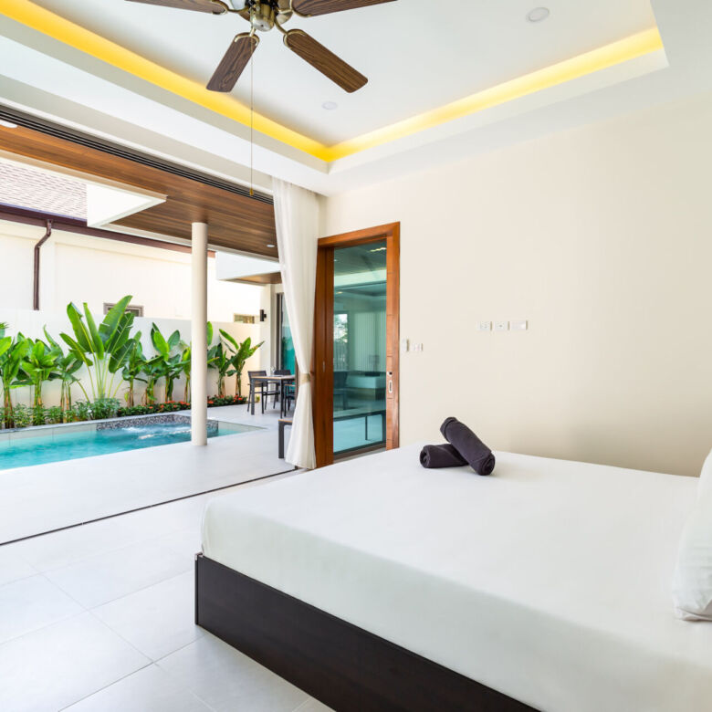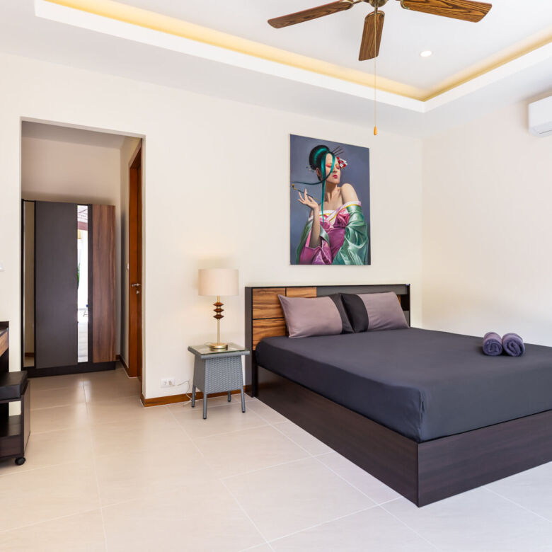 Built in a modern Thai-Balinese style, the villa wraps around a lush, tropical private pool, creating a peaceful and inviting environment. Two of the four ensuite bedrooms open directly onto the pool deck, while the fourth bedroom is privately situated upstairs with its own balcony and relaxing pool view—ideal for guests or as a master retreat.