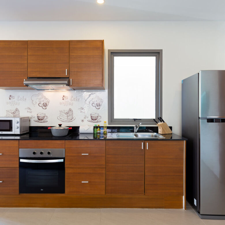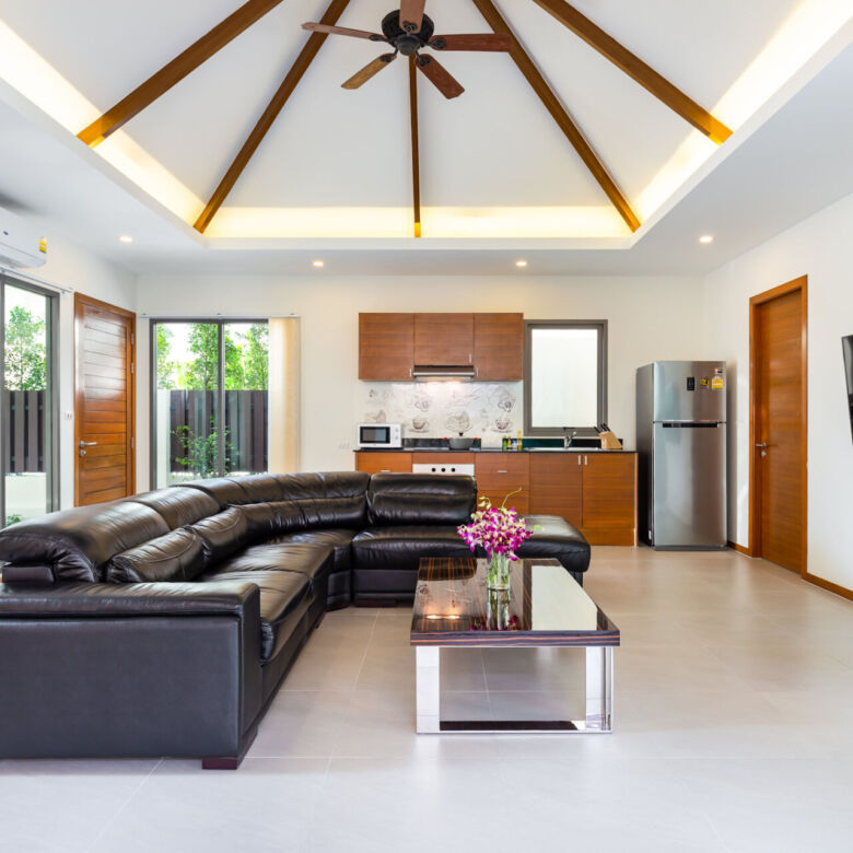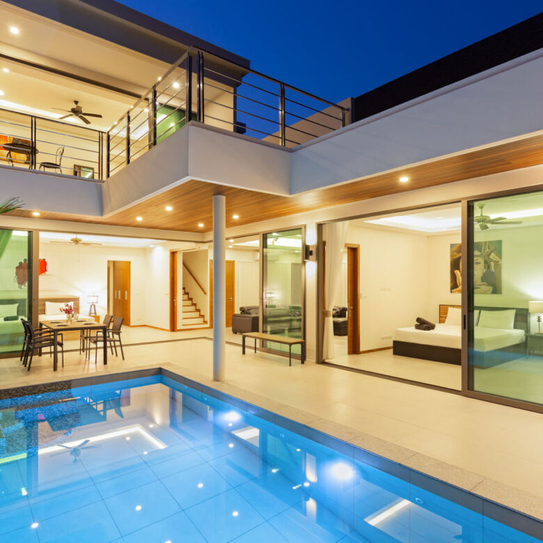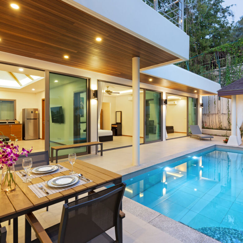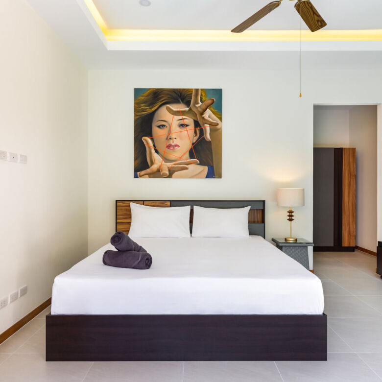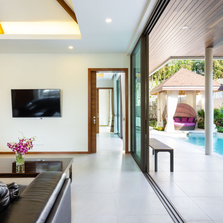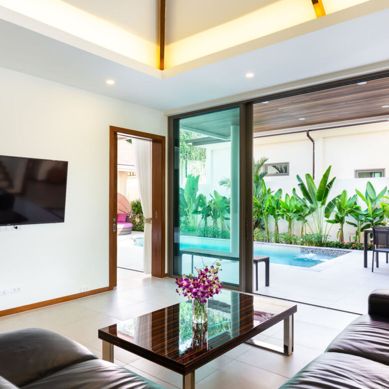 Built in a modern Thai-Balinese style, the villa wraps around a lush, tropical private pool, creating a peaceful and inviting environment. Two of the four ensuite bedrooms open directly onto the pool deck, while the fourth bedroom is privately situated upstairs with its own balcony and relaxing pool view—ideal for guests or as a master retreat.
