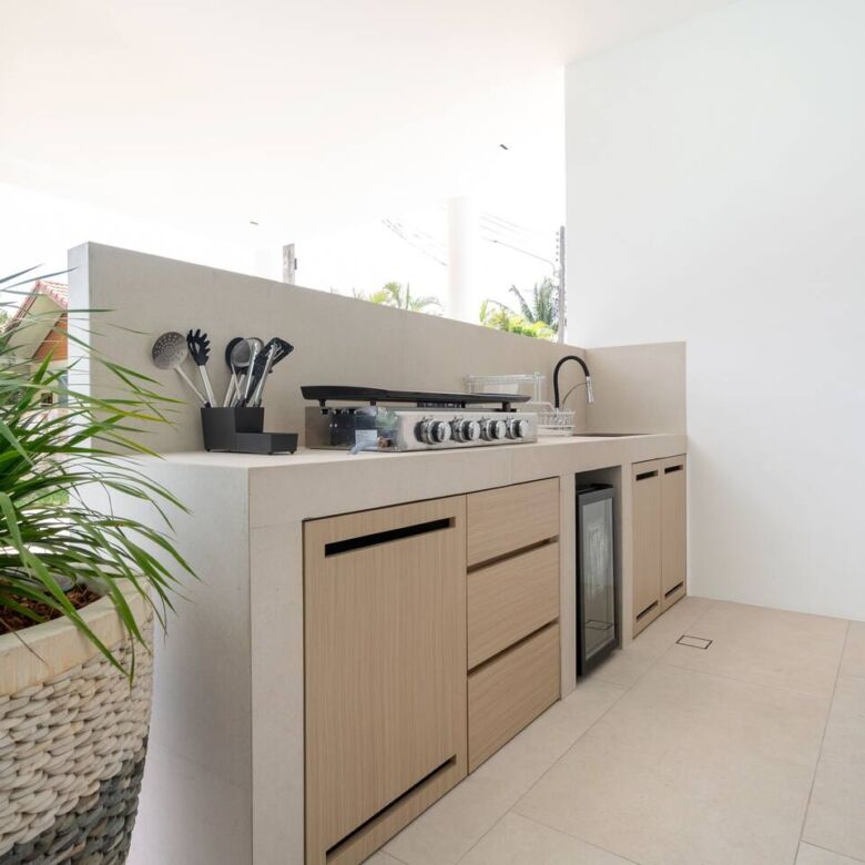 Set on a 360 sqm land plot with a total usable area of 447 sqm, this two-story property is designed for seamless tropical living. Each bedroom comes with its own ensuite bathroom, and the villa features high-quality finishes throughout, including a fully equipped American kitchen, open-plan living and dining area, and private water well—which means no water bills.