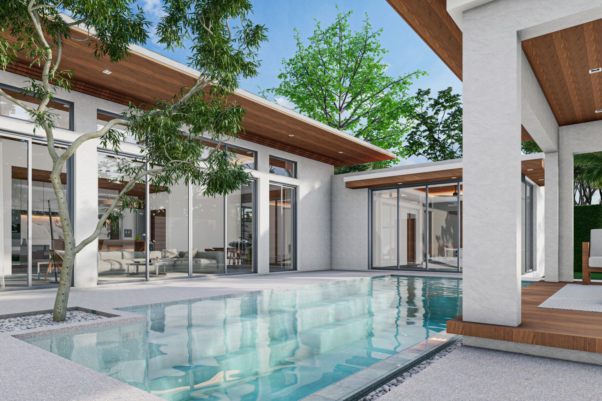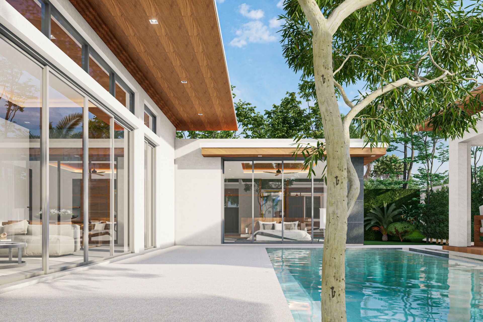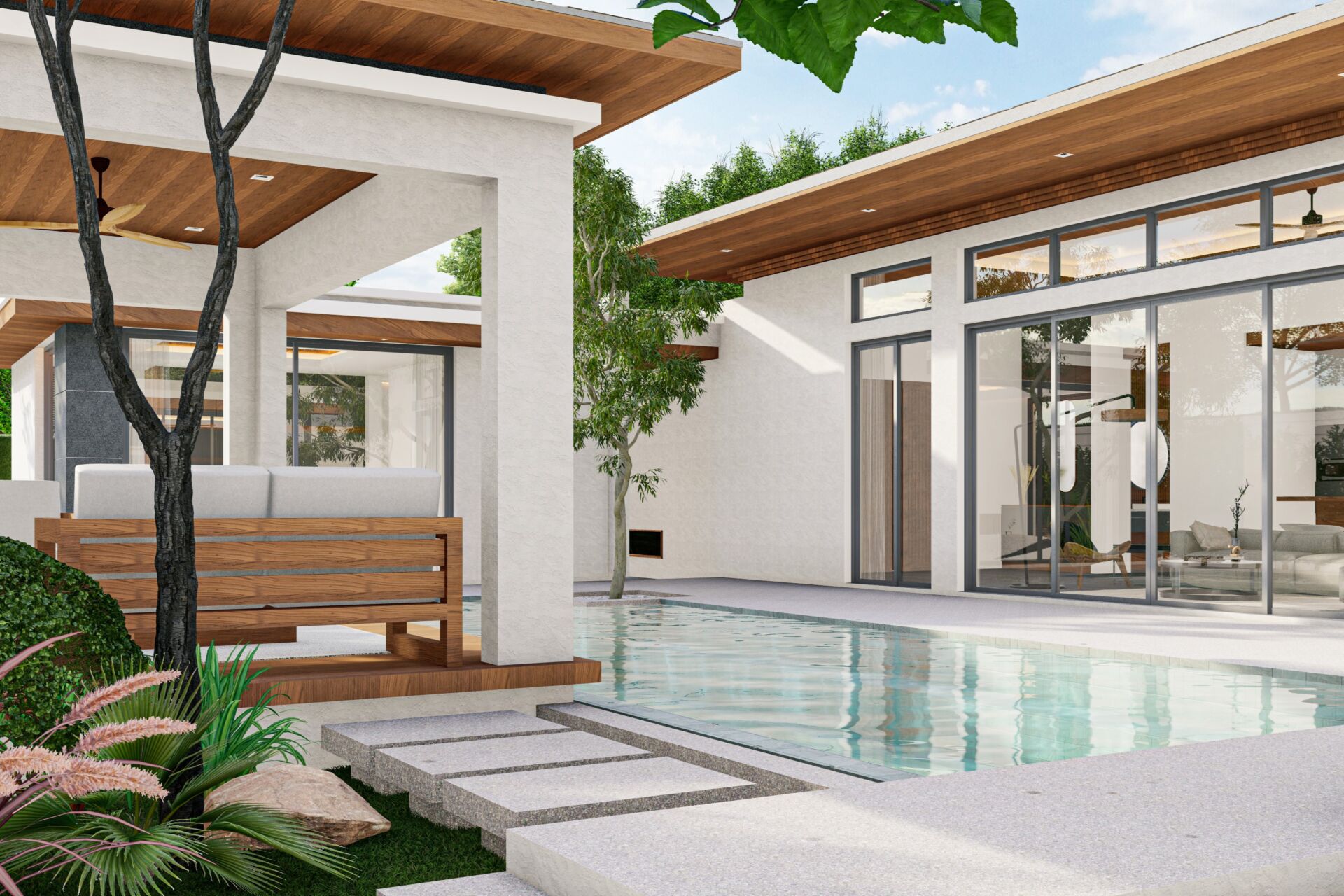 Mouana Breeze Mai Khao spans 13‑6‑71 rai (23,484 sqm) and comprises 27 premium villas, each designed with high‑quality materials and elegant aesthetics. The villas feature generous living areas, high ceilings, expansive glass façades, and private swimming pools surrounded by beautifully landscaped gardens.
