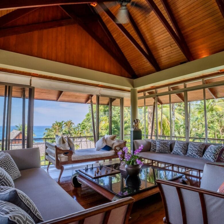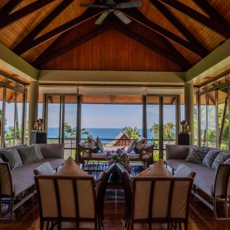 - Spacious Design: Spread over 2,200 sq. m of land with over 900 sq. m of living space across two levels, including a 120 sq. m upper living area with sweeping Andaman Sea views and a 75 sq. m family/TV room.