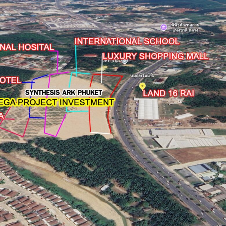 Prime 16 Rai Development Land in Koh Keaw, Phuket, offers unmatched visibility on Highway 402, directly opposite the landmark Synthesis Ark Phuket mega-project—a 500-rai mixed-use smart city valued at over 50 billion THB. This strategic positioning ensures exceptional access and future value appreciation amid Phuket’s booming central growth corridor.