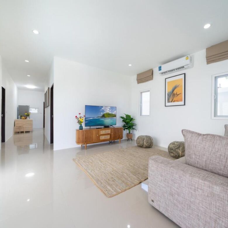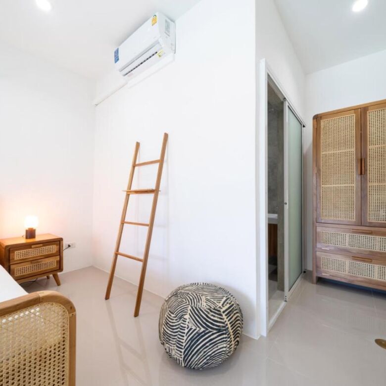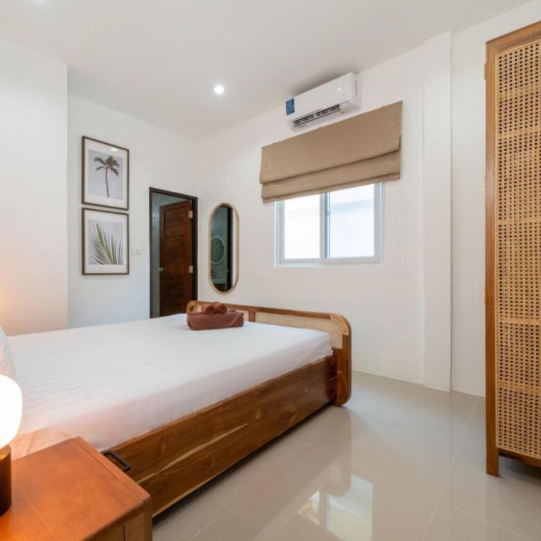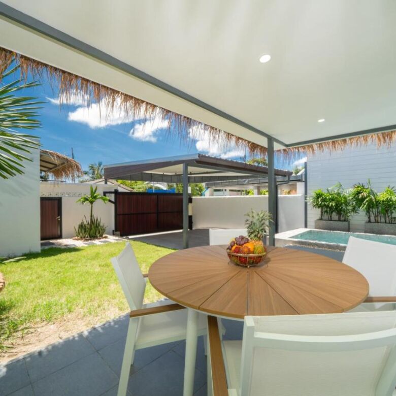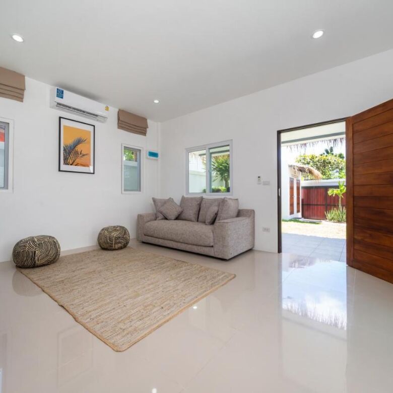 With 120 sqm of built space on a 210 sqm freehold land plot (with Thai company), the villa includes two ensuite bedrooms, an open living and dining area, and a fully equipped kitchen. The design opens onto a tranquil patio with outdoor seating, perfect for relaxed island living.