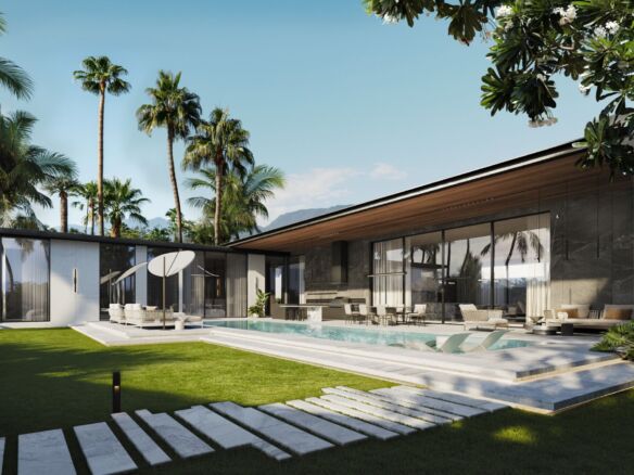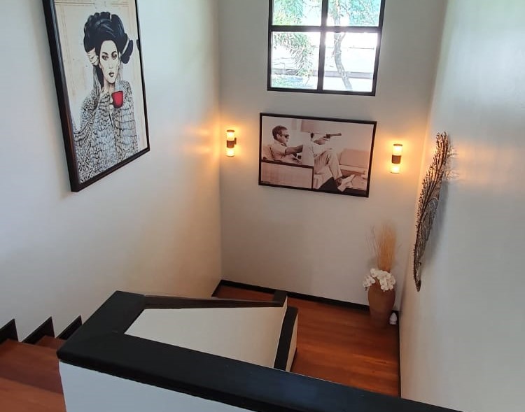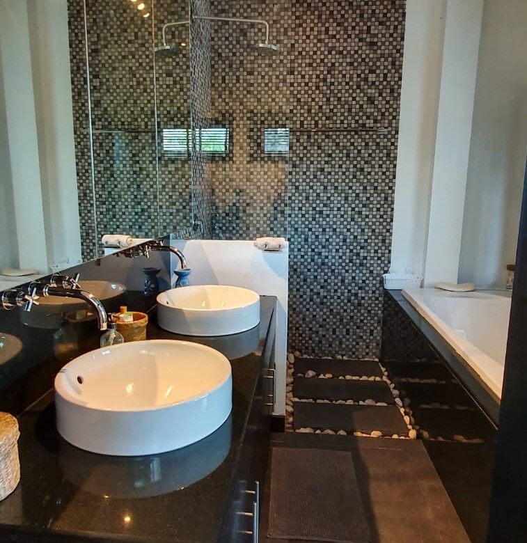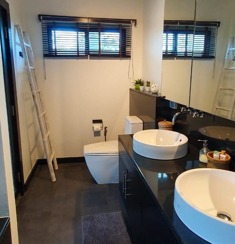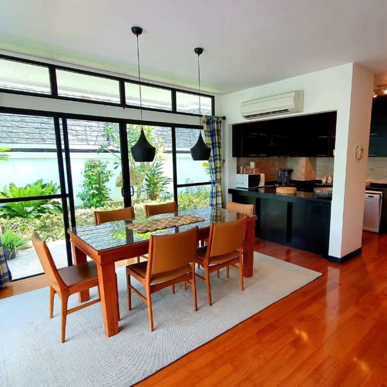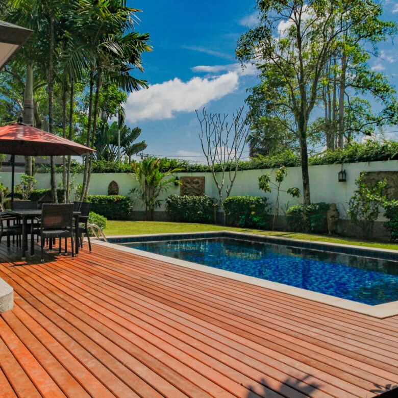 Set across two spacious levels with 325 sqm of luxurious living space on a generous 623 sqm plot, the villa is fully finished with premium teak wood flooring throughout. It features a stunning 7.5 x 4 m private swimming pool surrounded by a beautifully landscaped garden, creating the perfect tropical retreat. The expansive deck terrace is equipped with four sunbeds and a large dining table – ideal for sunset entertaining or relaxed outdoor living.