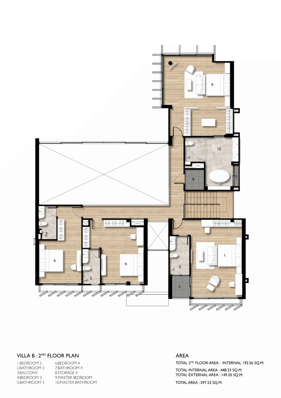 - Villa B: Approx. 597 sqm total built-up area