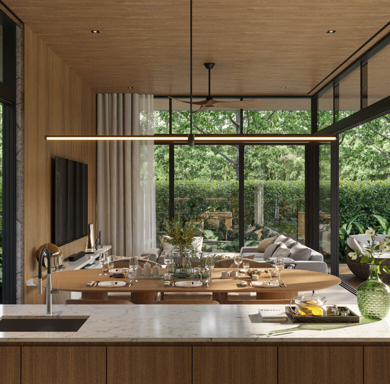 - Modern Interiors: Open-plan living and dining areas with high ceilings (2.6m – 3.6m) and floor-to-ceiling windows that invite the outdoors in.