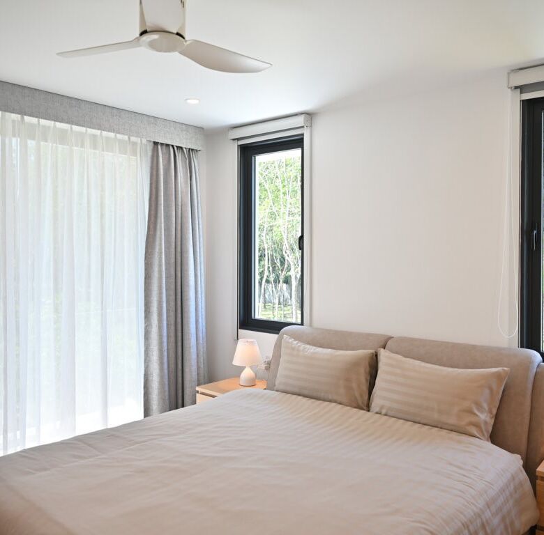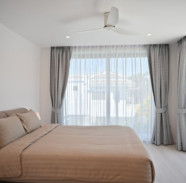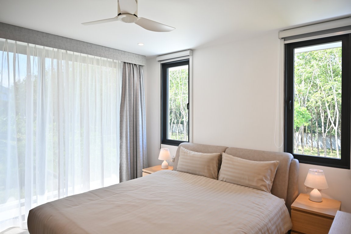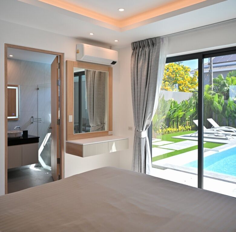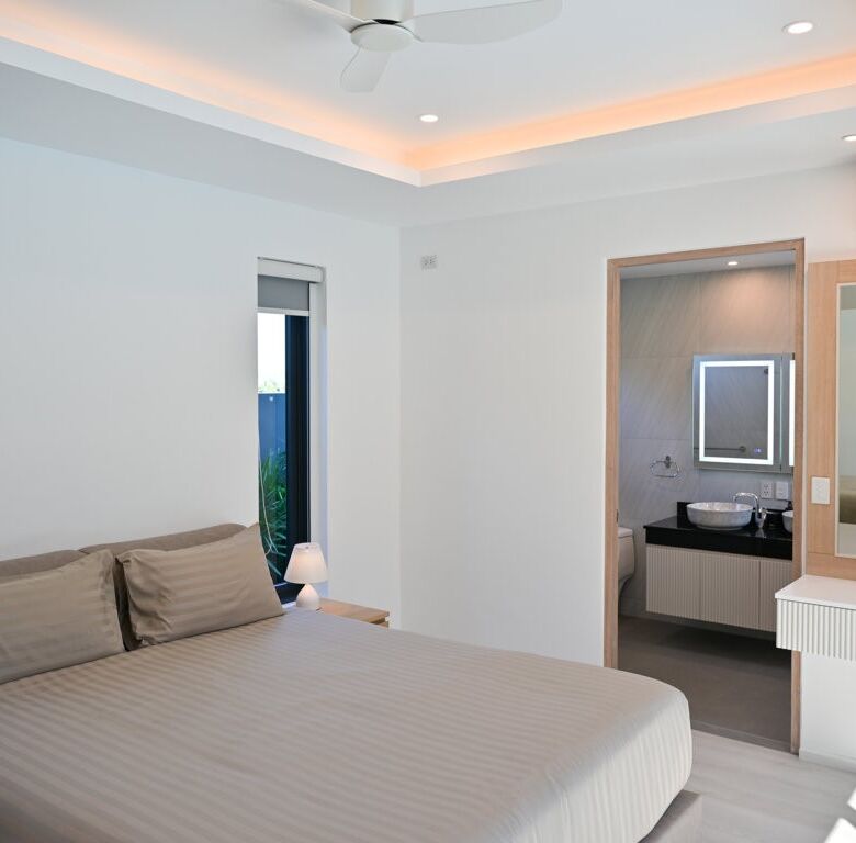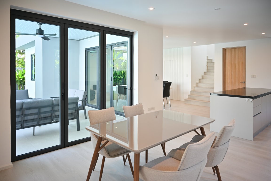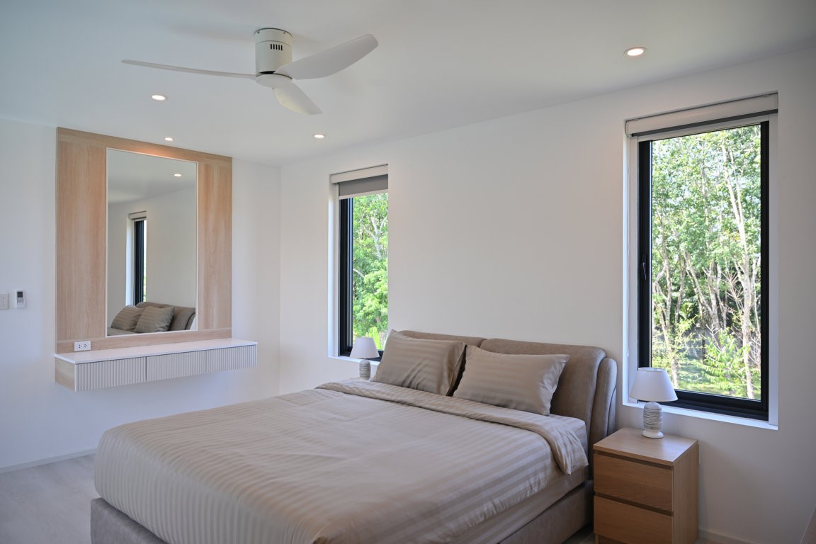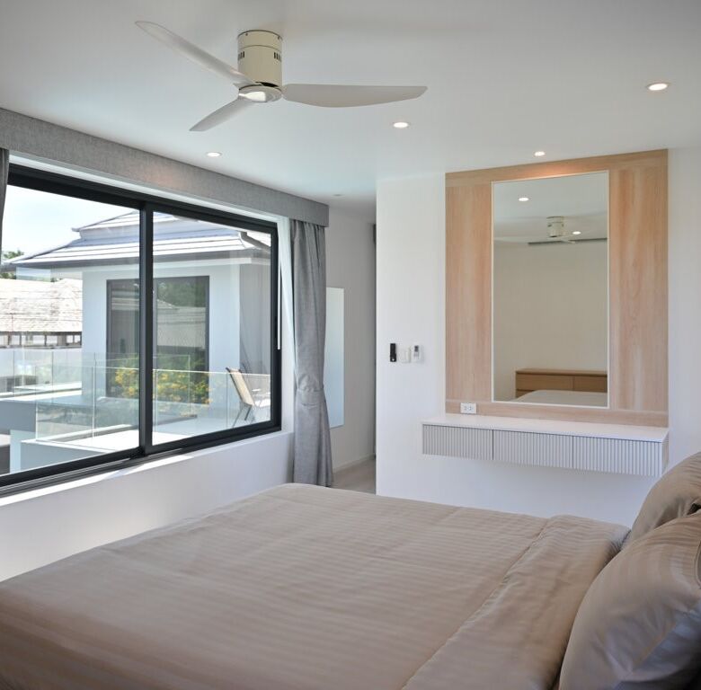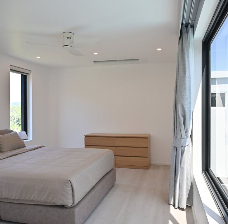 The Greyhouse is designed with a modern minimalist aesthetic, featuring clean lines, neutral grey tones, and expansive glass elements that invite natural light throughout the home. The villa emphasizes indoor-outdoor living, allowing residents to fully embrace Phuket’s tropical climate.