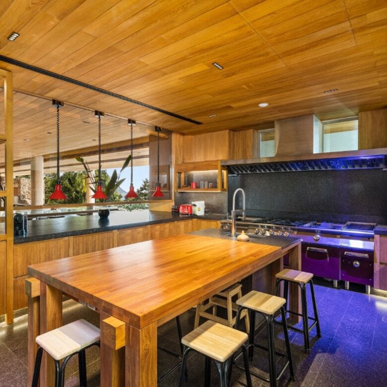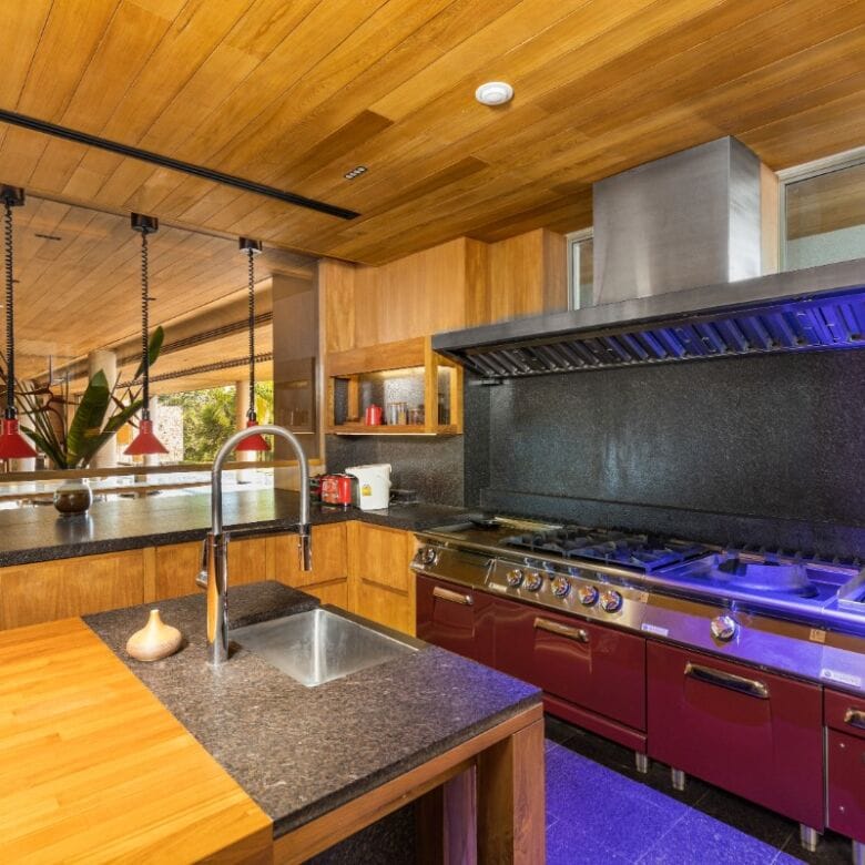 The villa boasts a fully equipped, professional-level, Western show kitchen, where culinary aspirations come to life. Immerse yourself in the art of gastronomy with top-of-the-line Italian commercial kitchen appliances and bespoke teak furniture. The poolside covered seating area provides the perfect setting for al fresco dining under the stars.