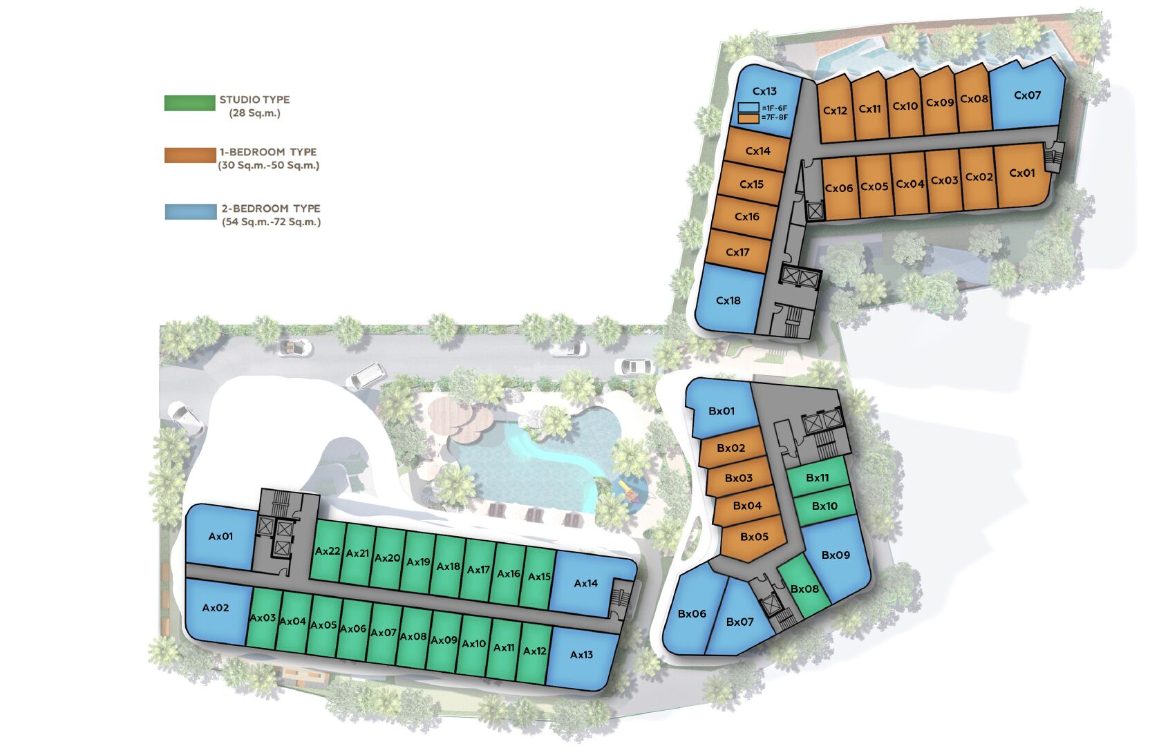 Project Highlights Spanning a generous land area of 3-2-73.4 rai (approximately 5,893.6 sq.m), VIBE Residence features a built-up area of 28,700 sq.m across three elegant low-rise buildings: one 5-storey and two 8-storey structures. With a total of 309 thoughtfully designed units and 173 parking slots (including car and motorcycle spaces), the development emphasizes space, privacy, and modern aesthetics.