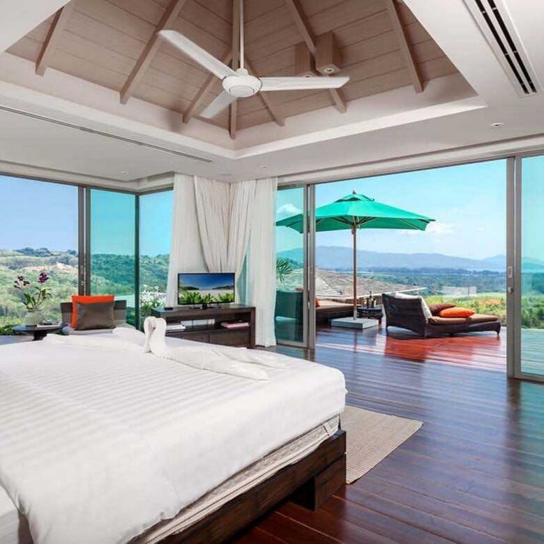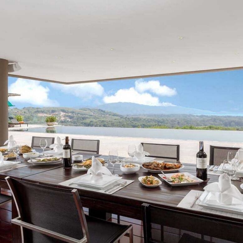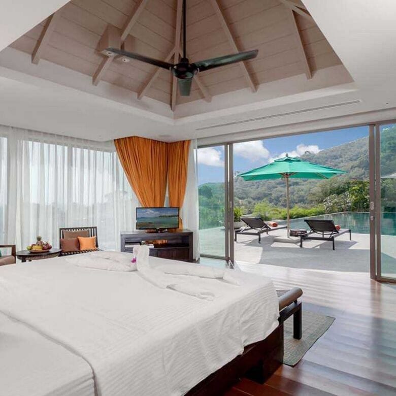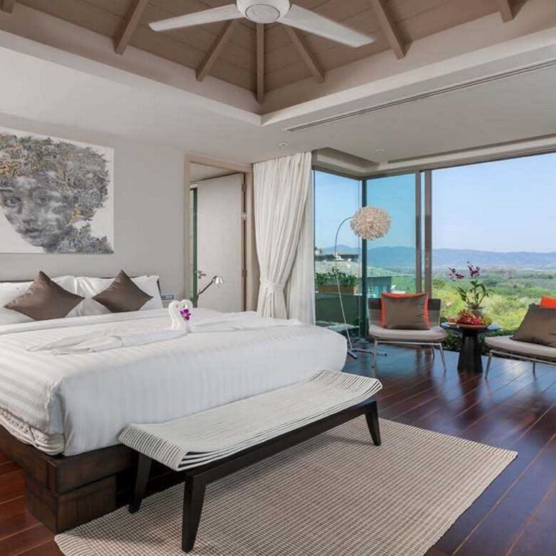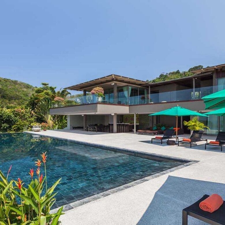 Villa Tropical Castle, one of Phuket’s largest and most luxurious villas, featuring 18 elegantly designed bedrooms. Perched on a hillside near Layan Beach, this expansive retreat offers breathtaking views of the Andaman Sea and Phuket’s west coast, making it an ideal destination for large groups seeking exclusivity and grandeur.